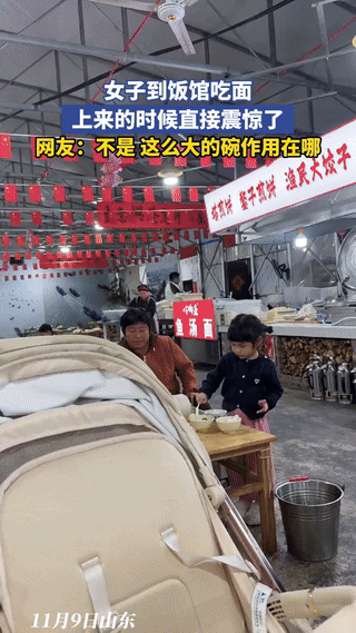 万万没想到!山东一女子到饭馆吃面,当服务员推着餐车上面的时候,女子直接被吓到了!盛面的碗超级大,难道这就是传说中的大碗面吗?网友:“真正的海底捞!” 本来女子就听朋友说,一家餐馆的咕嘟鱼大碗面挺好吃的,但就是碗有点大! 女子心想,吃一碗面碗能有多大?结果,当大碗面用推车送上来的时候,女子直接震惊了! 我的天,这碗真的超级大!但是又仔细一看里面的面却少的可怜,实在想不通这么大的碗作用在哪? 有网友评论,也好处多多啊,面大!气派!还不会把汤水溅到衣服了 还有网友说,小车推来一看见碗,大吃一惊,碗放上桌,一看碗里,大吃一惊。 好不好吃另说,面条成本0.2元,小鱼0.5元,调料0.2元,不计店租和人工费,成本0.9元,一碗68元。 作为北方人的我,我还真的吃不饱,不得不说确实有点虚张声势了,大海碗送餐,临近一瞧,碗底食物少得可怜兮兮。 你们觉得呢?