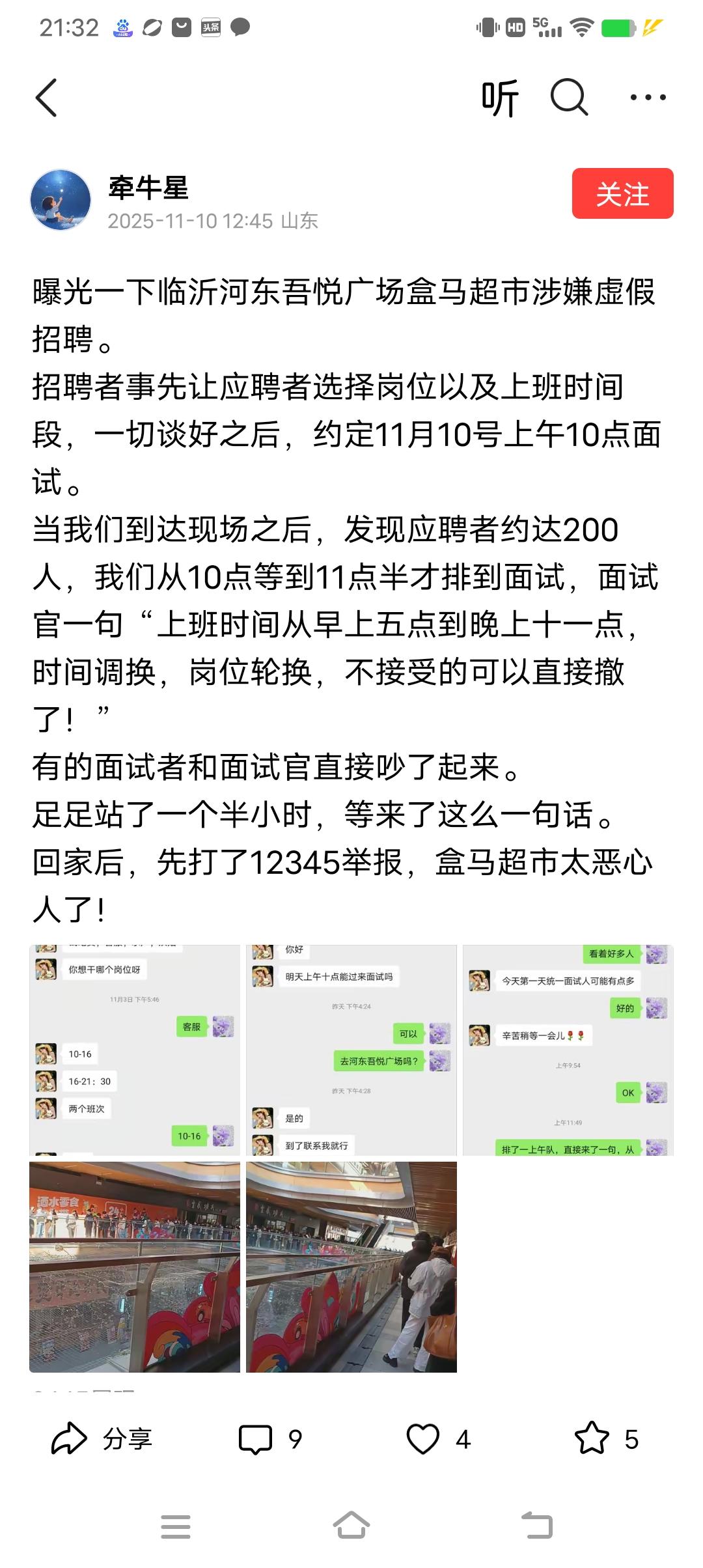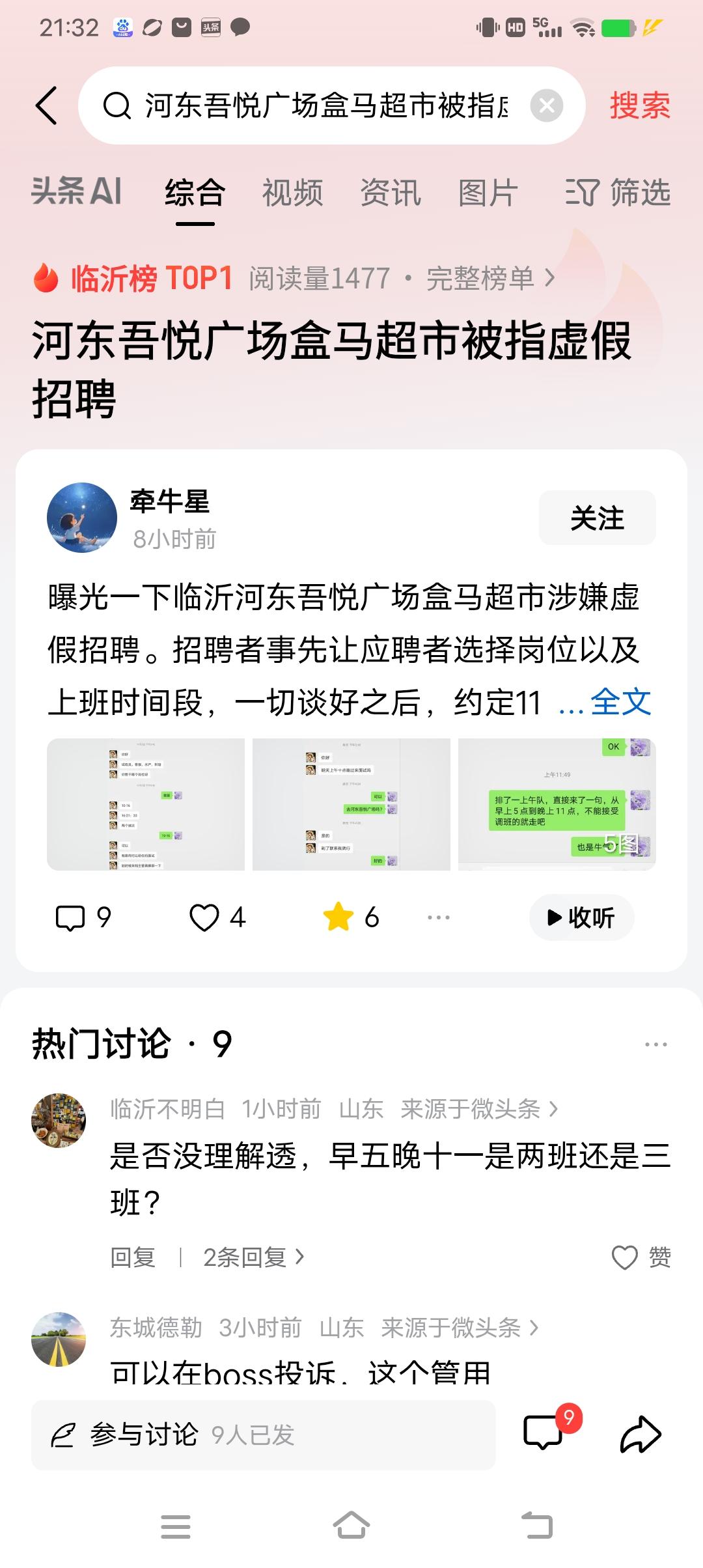 今天这个临沂头条很有意思,有网友吐槽最近很热的河东吾悦盒马,可能是现在想找工作的人太多了,时薪18元,应该有点诱惑。真心希望盒马招聘能正规点,不要寒了求职者的心,也不要辜负了临沂人的信任。欢迎大家留言文明交流!