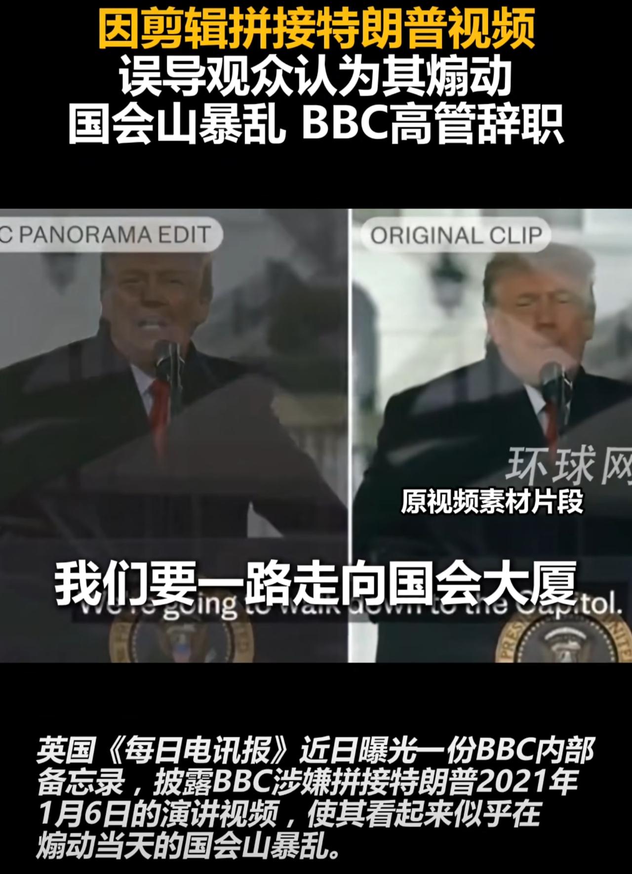 BBC还有真新闻吗?最近BBC总裁和新闻部门高管引咎辞职,原因是有栏目剪辑了一段特朗普演讲的视频,视频中的特朗普说:“我们要一路走向国会大厦,我会和你们在一起,我们要战斗,我们要拼尽全力战斗。”给人的感觉是特朗普在煽动国会山暴乱,对美国都是这样,可想而知这么多年来,BBC抹黑中国有多猖獗。