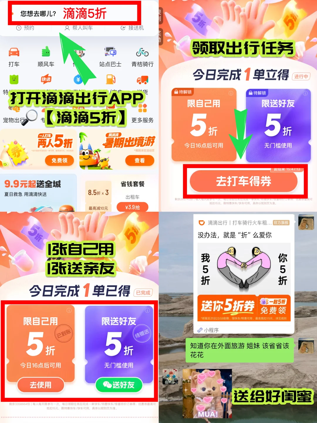 ✅打开滴滴APP 目的地栏搜索🔎“滴滴5折”领取任务 打一次快车/特惠快车🚗 就🉑得两张5折券 自己一张 还能送人一张 具体活动城市 时间及活动规则可见APP活动页面~