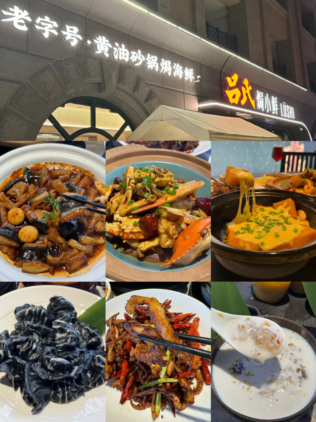 ➡️第一天:推荐青岛老店吕氏焗小鲜‼️就在金沙滩附近,店里装修精致,环境挺舒服的~菜品很新鲜,招牌鳗鱼蹄筋非常推荐,拌米饭🍚超nice!年糕香辣蟹、黄油芝芝南瓜、煽鱿鱼真是大饱口福