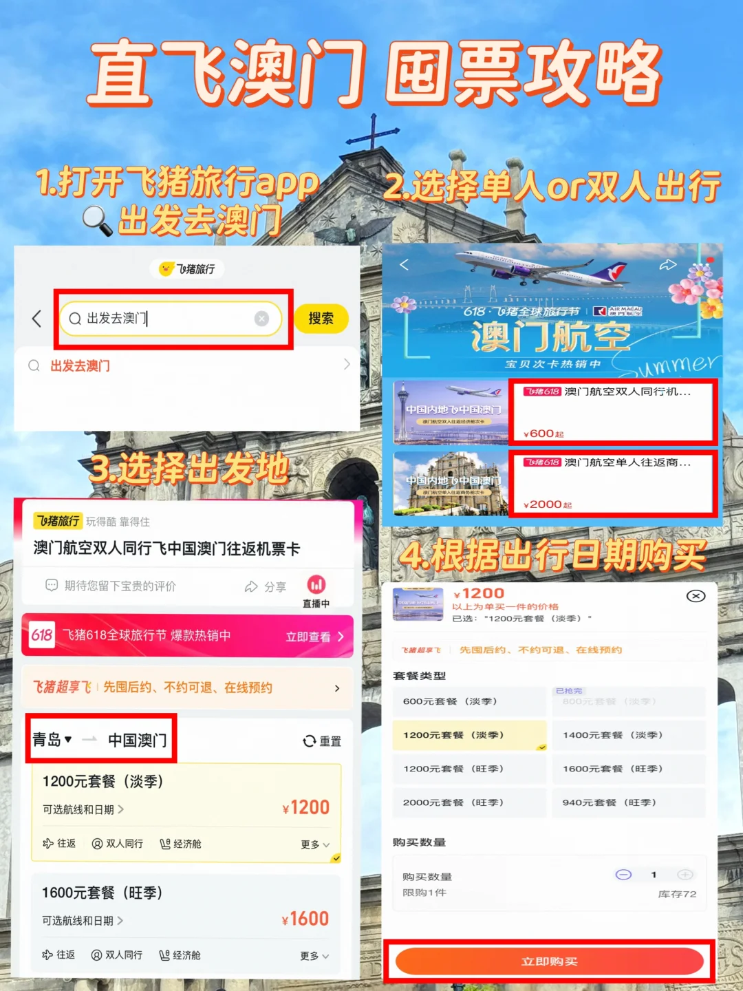 去「飞猪旅行」🔍「出发去澳门」或「澳门航空双人游」就能囤票啦 重点是不预约可退‼️这波我先囤为敬✌️