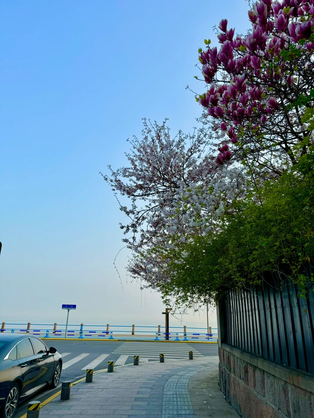 “能看海的樱花树,挨着一棵紫色玉兰花”