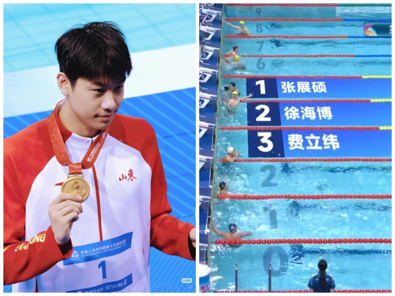 我有种预感, 游泳队的新记录, 不是潘展乐,不是孙杨,而是, 刚满18岁的小将张展硕! 我去查了一下, 他在11岁参加山东省运动会,就拿下三块金牌,打破两项纪录! 在今年的全国游泳锦标赛中以3分42秒99刷新男子400米自由泳世界青年纪录! 这次的第15届全运会上,他又比世界青年纪录快了,3分42秒82! 不得不说,山东队在自由泳上的成绩都好强呀! 400米自由泳 18岁张展硕力压潘展乐孙杨夺冠