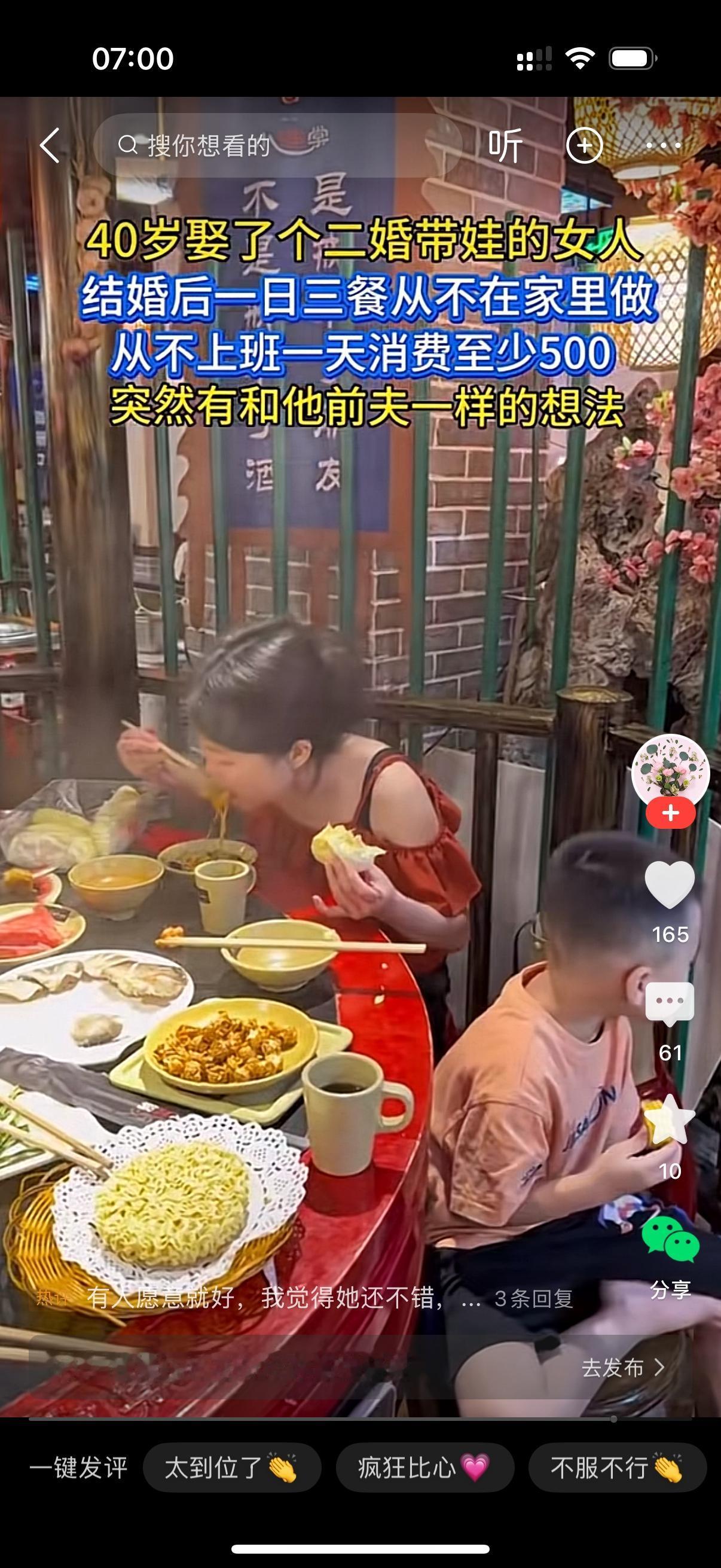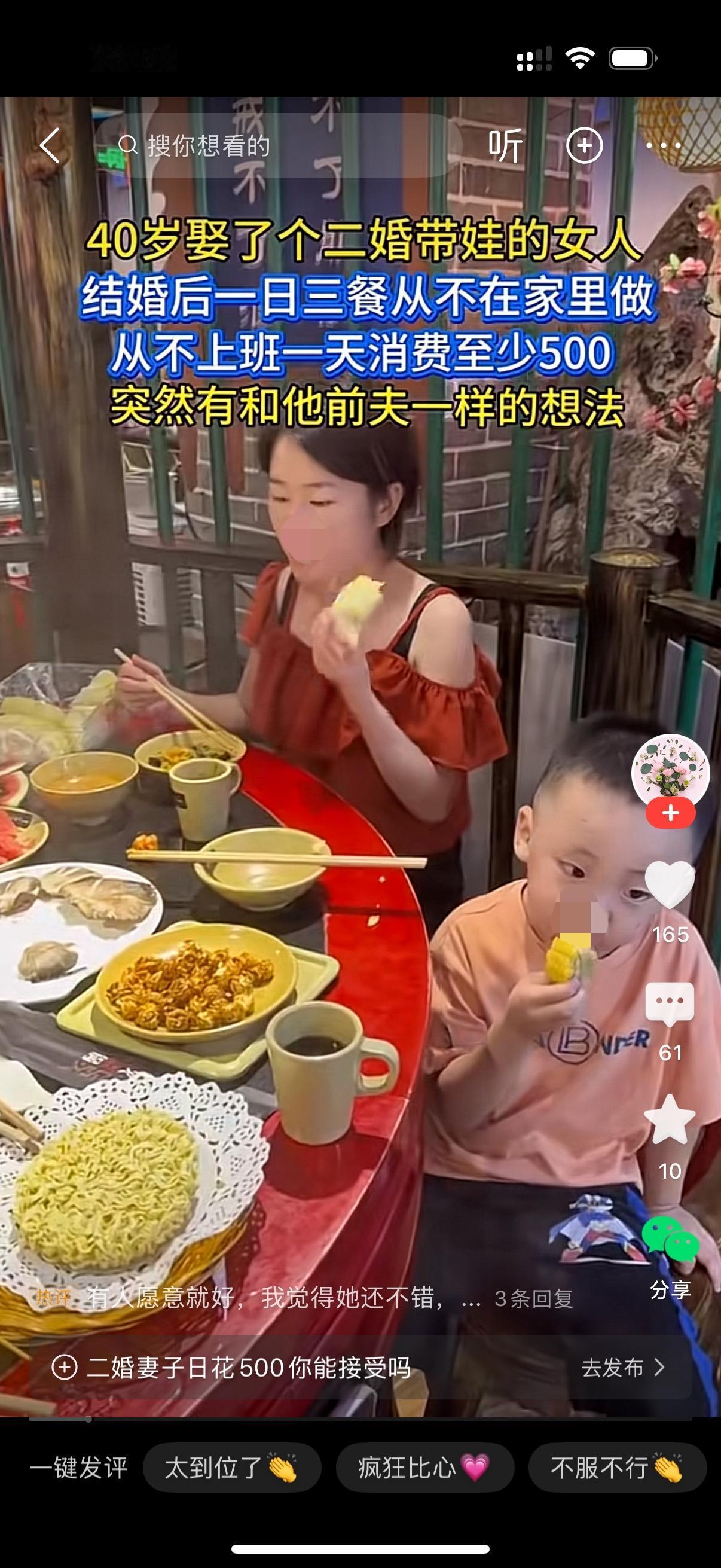 40岁的男子娶了一个二婚带娃的女人。结婚后,女人不上班工作,从不做饭,一日三餐都是在外面消费,每天消费500块。男人有点支撑不住了,他希望妻子能够在家里做饭吃,节省点开支。没有想到,女人坚决不同意在家里做饭,说什么做饭的油烟会损害自己的皮肤,毁掉自己的容颜。男人心里那个悔啊,他突然有了和她前夫一样的想法。