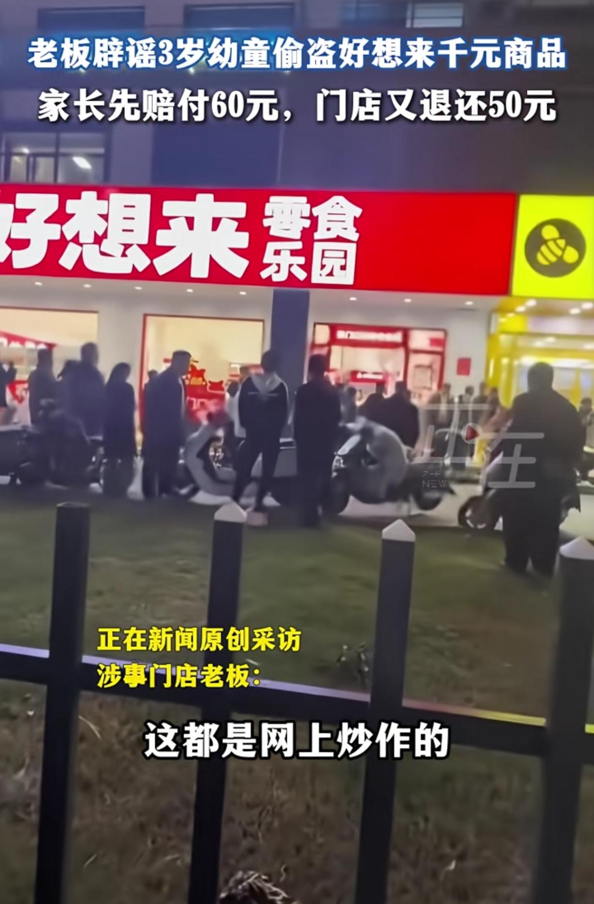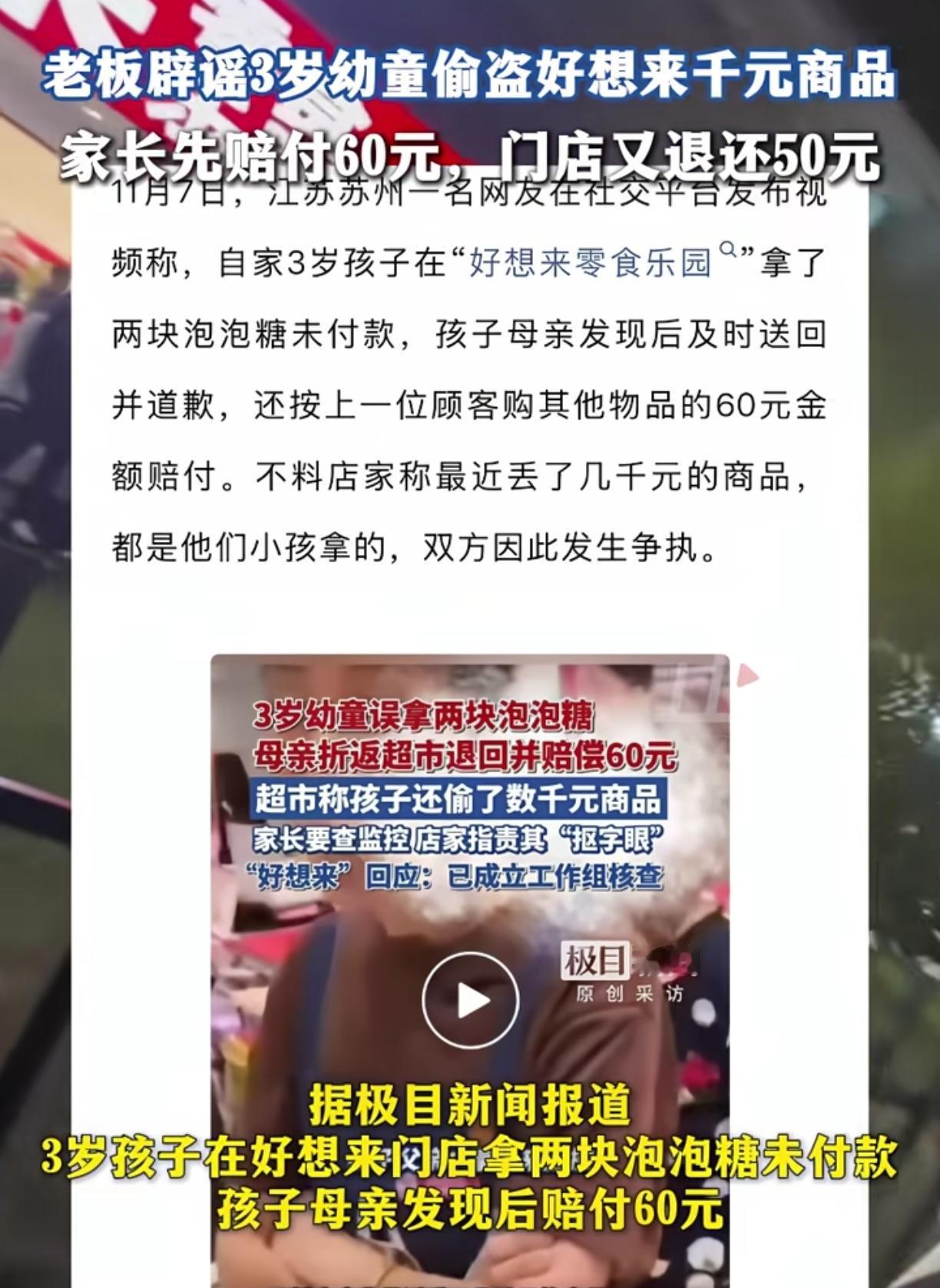 昆山好想来冤枉小孩偷千元商品后续 老板说这是“网上炒作,不是事实”,家长赔付的60元,门店已退回50元,目前已成立调查组加急处理,让大家不信谣不传谣 反正我个人觉得这事很简单很好处理,把监控调出来就是了! 老板说啥都没用,监控能证明一切! 店员空口无凭的说人家“拿了几千元商品,天天来拿,小时候偷针,长大偷金” 大庭广众之下,这小娃得受多少异样的眼光,主要是这事人家没做,还有口说不清,这么小的娃哪有“偷”这个概念呢? 拿了两块泡泡糖,人家长发现马上过来给钱了,这个妈妈已经很有素质了,可能就是因为这个妈妈答应的太爽快,店员才以为遇到了冤大头,让一个3岁的娃来“平账”那可再好不过了! 再说句不好听的,几千块钱的东西得用个三轮车来拉了吧,还说人天天偷分给其他孩子,按店员说的这金额,这娃不得2岁就开始过来逛了,你们说说这事可能吗? 支持孩子妈妈为孩子维权!