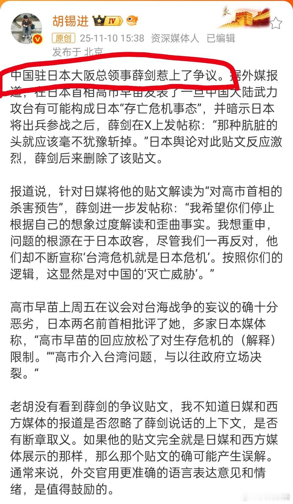 胡锡进评薛剑发言。说实话,老胡的评论中,大部分观点,我是赞同的。但第一句话,非常不专业。什么叫薛总领事惹上了争议?不应该是日本鬼子心里有鬼反扑咱们的薛总领事吗?是高市早苗没事找事吧,台湾问题跟日本有半毛钱关系吗?是日本鬼子没事找事吧,薛总领事这话有啥问题吗?一群鬼子群起而攻之合适吗?老兵时评