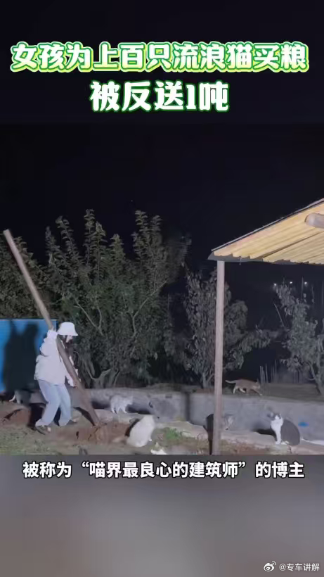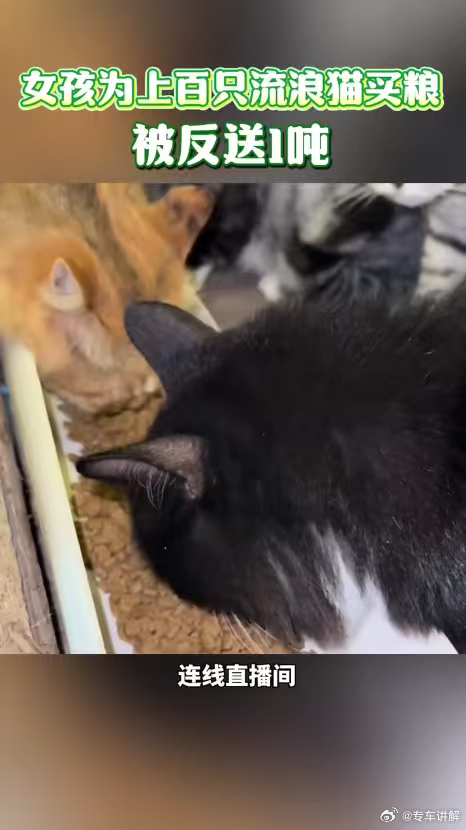 女孩为上百只流浪猫买粮被反送1吨喵届最良心的建筑师被送1吨猫粮 五月妈连线囤粮时说起:百只流浪猫每月吃千斤粮,还得改猫舍造家,主播当即送1吨粮砂,这波操作超暖心! ​​​