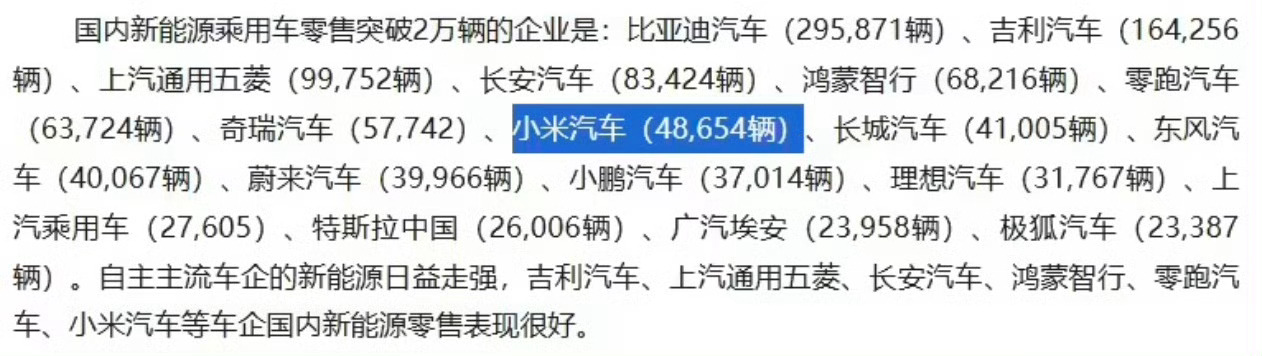 小米汽车官方并未公布具体的交付数据,不过在乘联分会今日公布的 2025 年 10 月份全国乘用车市场分析中,看到小米的销量,其中,小米汽车新能源乘用车零售 48654 辆、小米 YU7 车型批发销量超两万辆(33662 辆)。