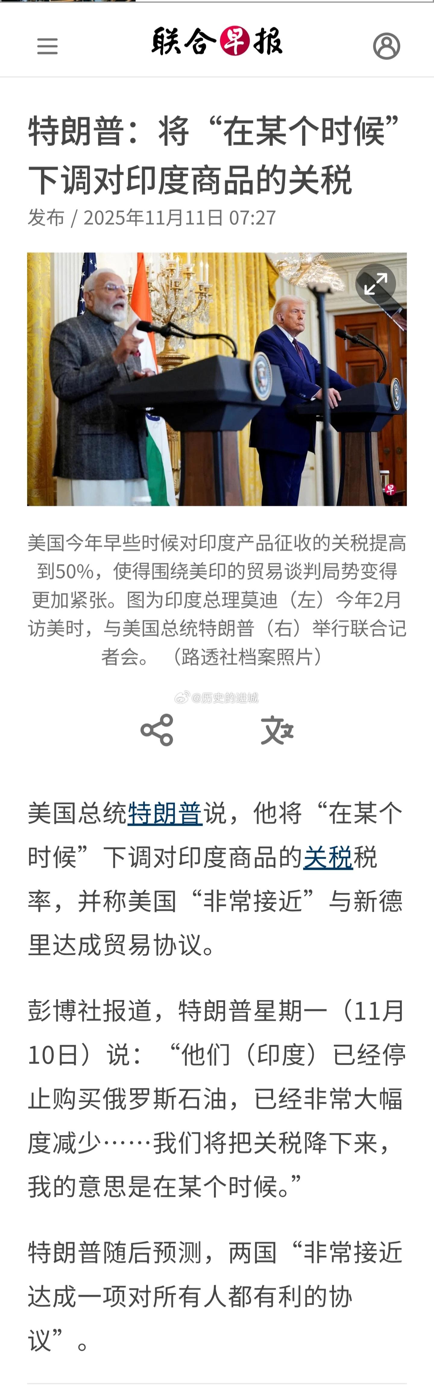 彭博社报道,特朗普星期一(11月10日)说:“他们(印度)已经停止购买俄罗斯石油,已经非常大幅度减少……我们将把关税降下来,我的意思是在某个时候”。特朗普随后预测,两国“非常接近达成一项对所有人都有利的协议”。