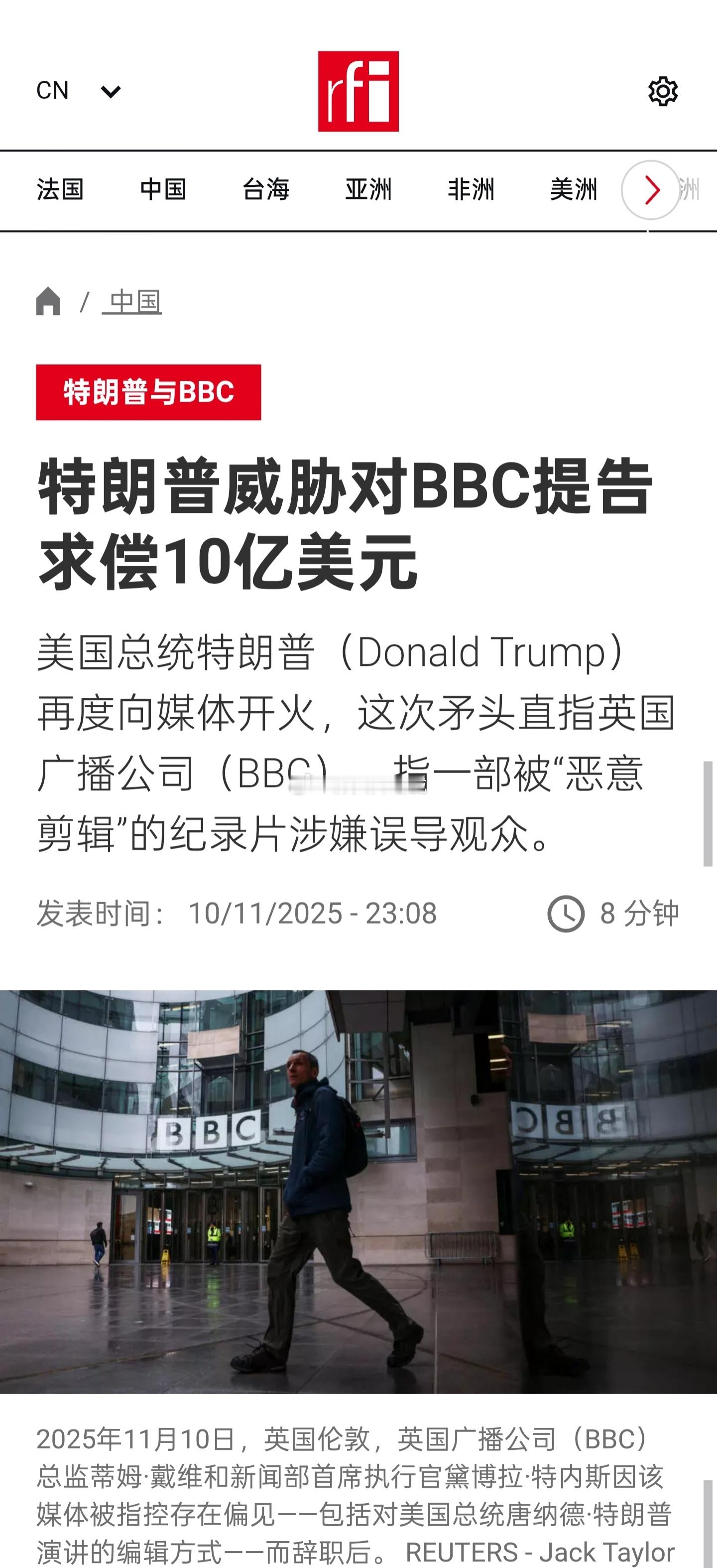 美国总统特朗普再度向媒体开火,这次矛头直指英国广播公司(BBC),指一部被“恶意剪辑”的纪录片涉嫌误导观众。特朗普的法律团队本周向BBC发出律师信,指控该公司“故意捏造内容、企图干预2024年美国总统选举”,并要求BBC撤回相关影片与发表道歉,否则将提起至少10亿美元的诽谤诉讼。