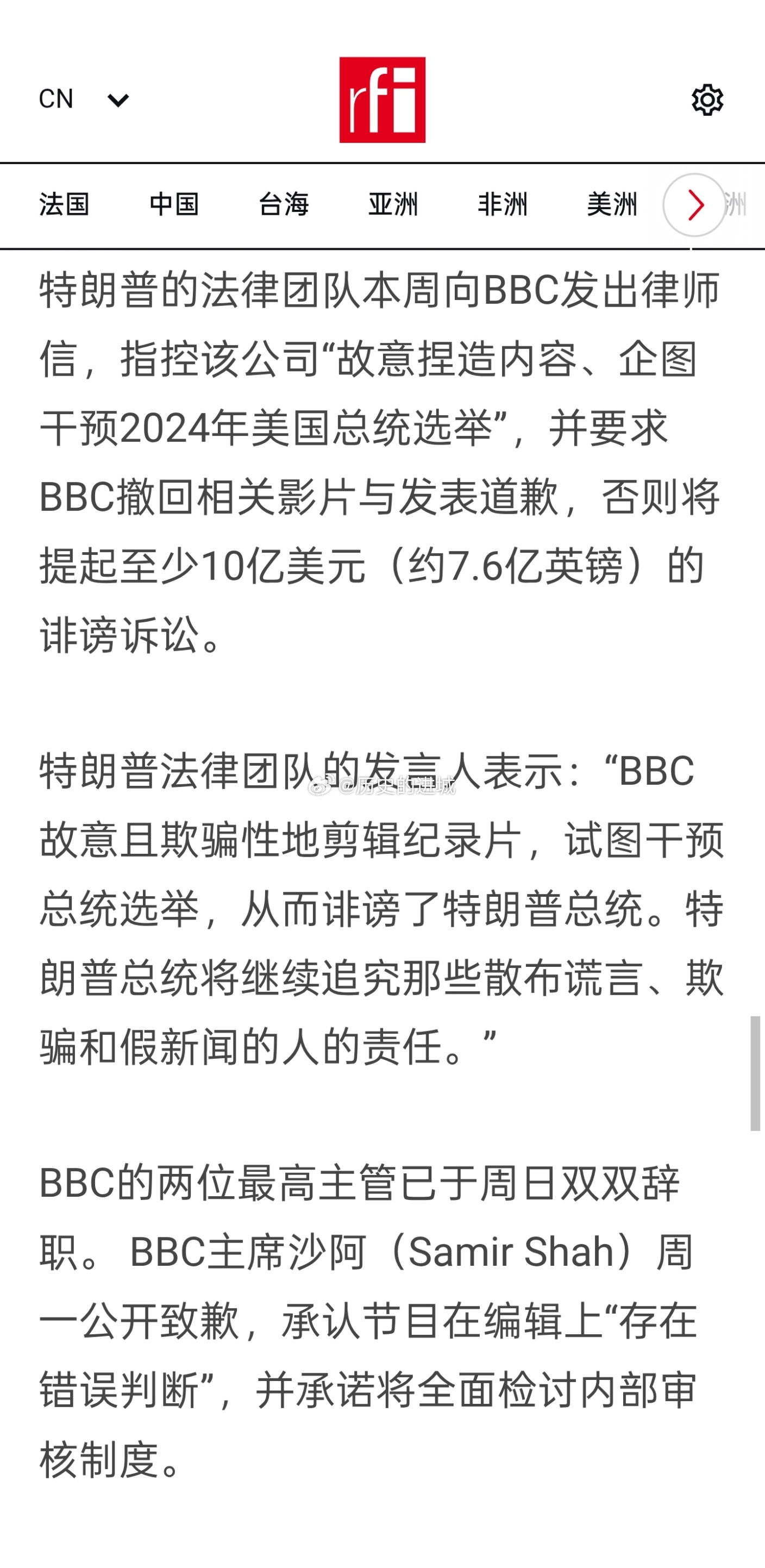 特朗普法律团队的发言人表示:“BBC故意且欺骗性地剪辑纪录片,试图干预总统选举,从而诽谤了特朗普总统。特朗普总统将继续追究那些散布谎言、欺骗和假新闻的人的责任。”