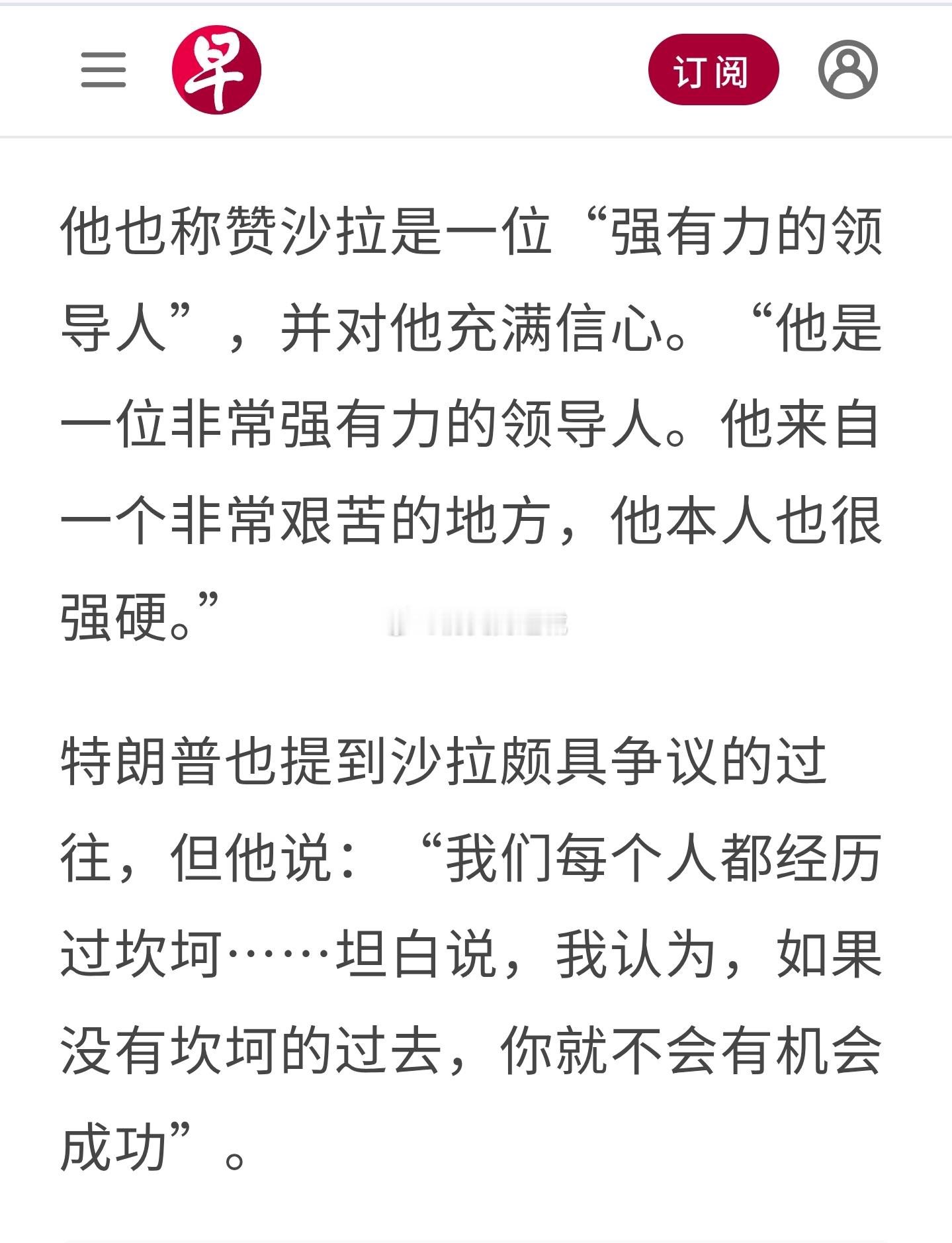 特朗普也提到沙拉颇具争议的过往,但他说:“我们每个人都经历过坎坷……坦白说,我认为,如果没有坎坷的过去,你就不会有机会成功”。