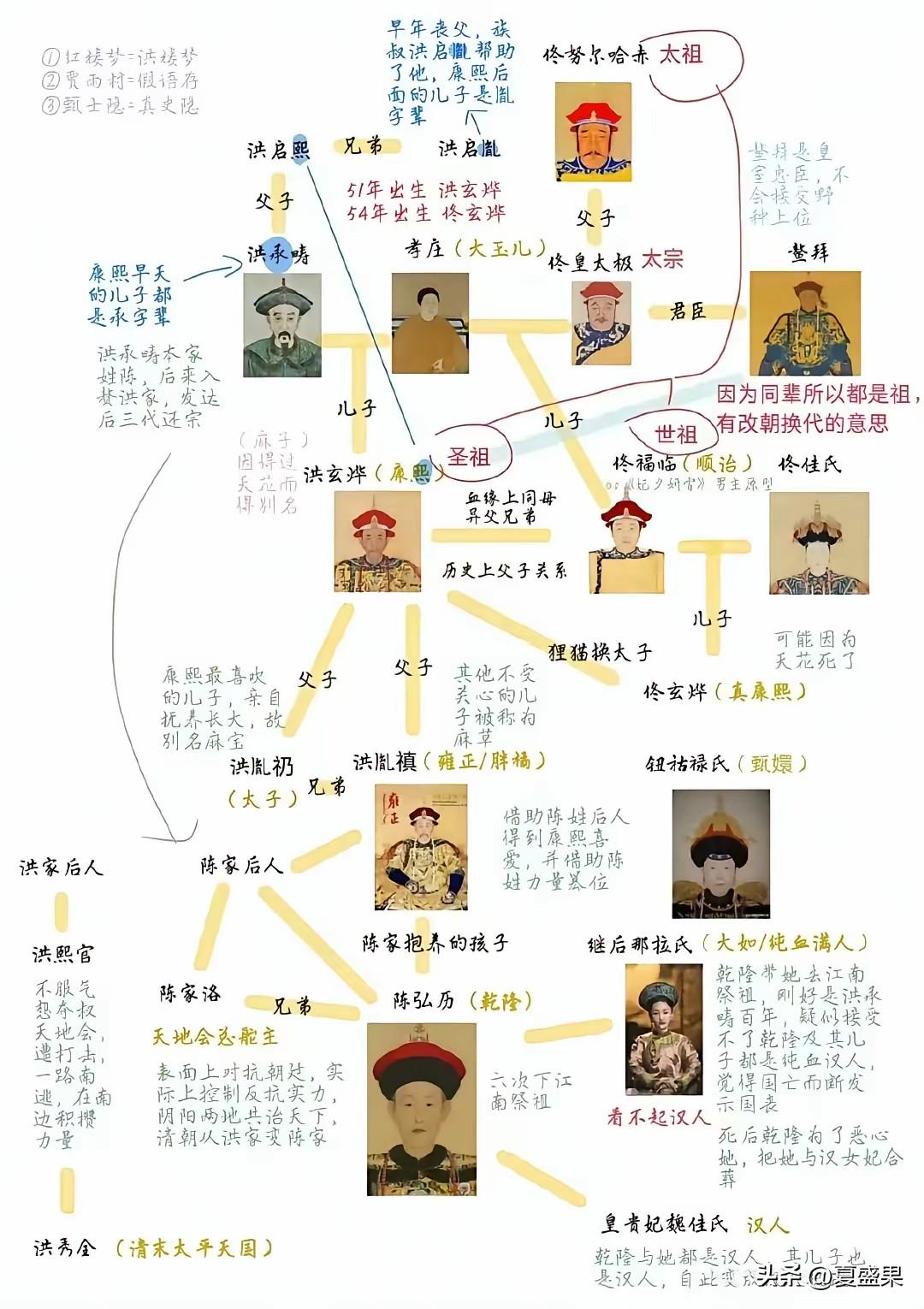 越扒越深, 清朝大瓜越吃越上头。 梳理下脉络,应该是从康熙往下清朝历代皇帝,跟努尔哈赤,皇太极,顺治,长得越来越不像开始的, 然后就怀疑到皇太极允诺孝庄“劝降”洪承畴,康熙的长相果然跟洪承畴如出一辙。 真康熙因出宫治天花被贾康熙替代,回宫的脸干净的像没得过天花一样,真康熙流落在外。 接着就是乾隆是汉人陈家的儿子,而洪承畴本来的姓就是陈。乾隆的皇后在南巡途中好好的断发赌咒乾隆,就是发现爱新觉罗早就换种了。乾隆六次下江南就是为了回老家祭祖。 现在又发觉红楼梦,甄士隐就是“真事隐”,贾雨村就是“假语村”,作者不是被狸猫换掉的皇子就是被换掉皇子身边的近侍。 因为,贾宝玉就是“假宝玉”,字元璋,身边的袭人,就是“龙衣”,宝玉、贾珠、贾元春合起来就是朱元璋! 现在版本越来越多,专家专门出来辟谣,可是没人接受。 为什么,就是因为好多事儿解释不通。 1、孝庄确实劝降了洪。 2、康熙确实得过天花,在古代是不治之症,却没死,不但没死,脸上也没有落坑。 3、康熙为孝庄守孝三年,为生母守孝几天。 4、乾隆皇后正常的一个人突然断发诅咒皇帝,嫌自己的儿子不能继承大统理由太牵强。 5、红楼梦隐喻太多,不经历过那种生活编不出来,让人不得不联想。 看来历史给我们留下太多的悬念和想象了,红学热应该持高不下,将来还会有更新奇的历史重现天日。