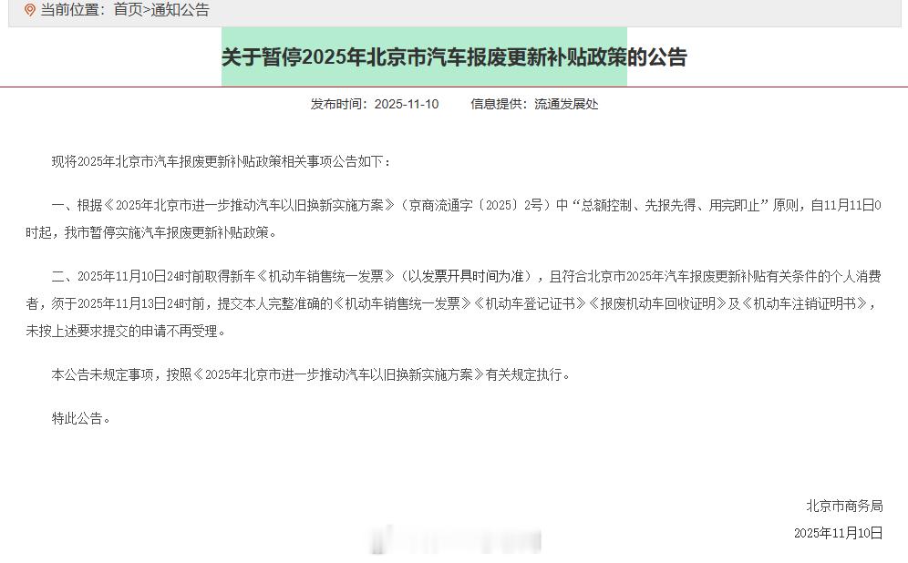 根据《2025年北京市进一步推动汽车以旧换新实施方案》中“总额控制、先报先得、用完即止”原则,自11月11日0时起,我市暂停实施汽车报废更新补贴政策。
