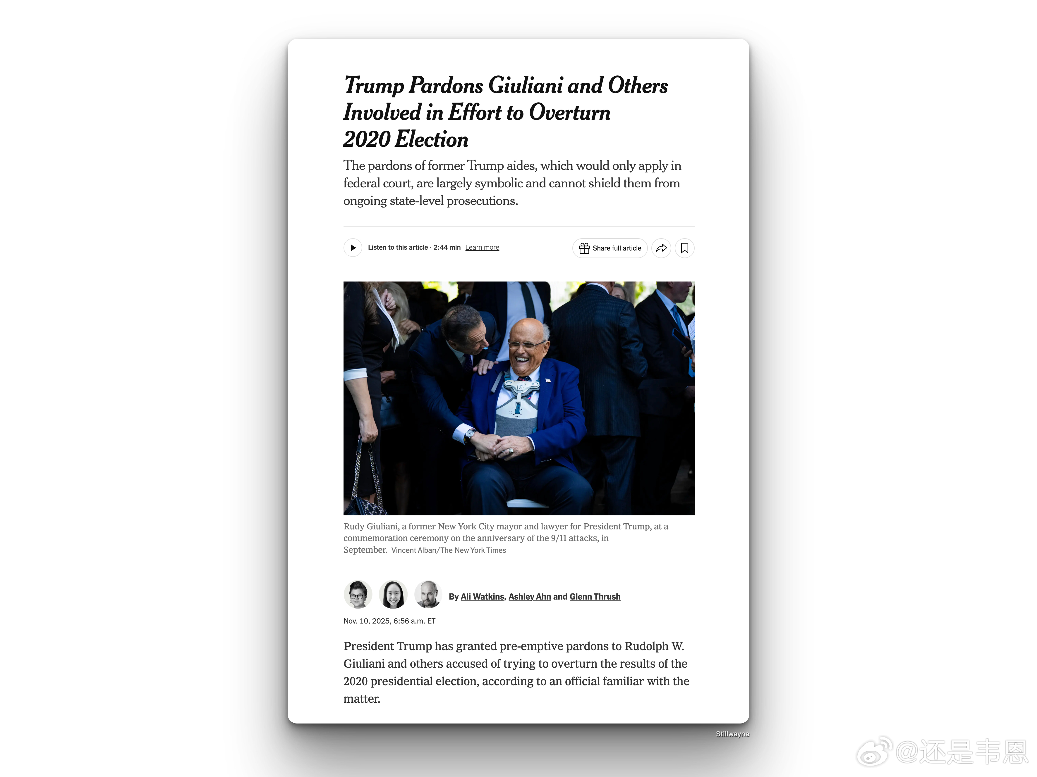 特朗普赦免朱利安尼及其他参与推翻2020年大选结果的人员朱利安尼是特朗普的前律师
