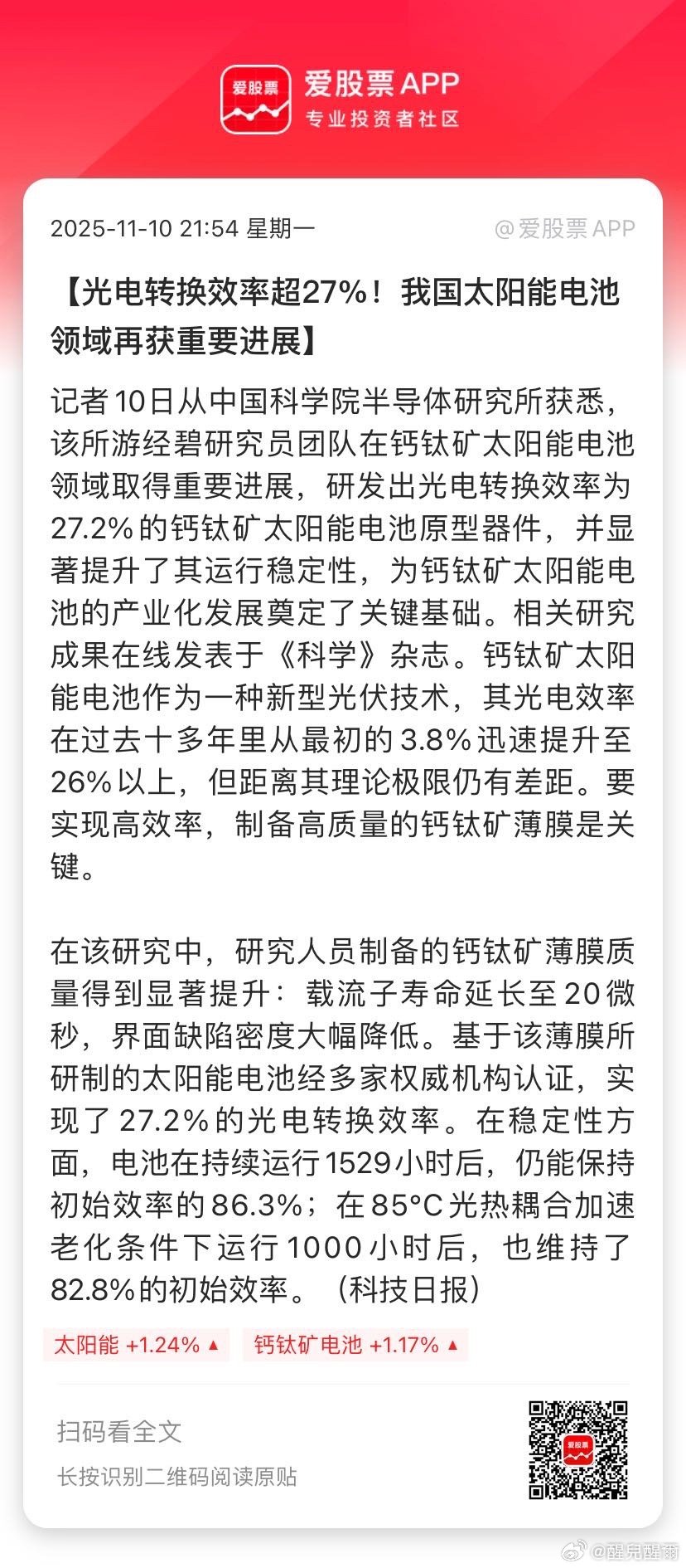 【光电转换效率超27%!我国太阳能电池领域再获重要进展】记者10日从中国科学院半导体研究所获悉,该所游经碧研究员团队在钙钛矿太阳能电池领域取得重要进展,研发出光电转换效率为27.2%的钙钛矿太阳能电池原型器件,并显著提升了其运行稳定性,为钙钛矿太阳能电池的产业化发展奠定了关键基础。相关研究成果在线发表于《科学》杂志。钙钛矿太阳能电池作为一种新型光伏技术,...