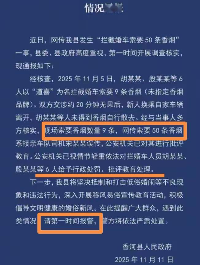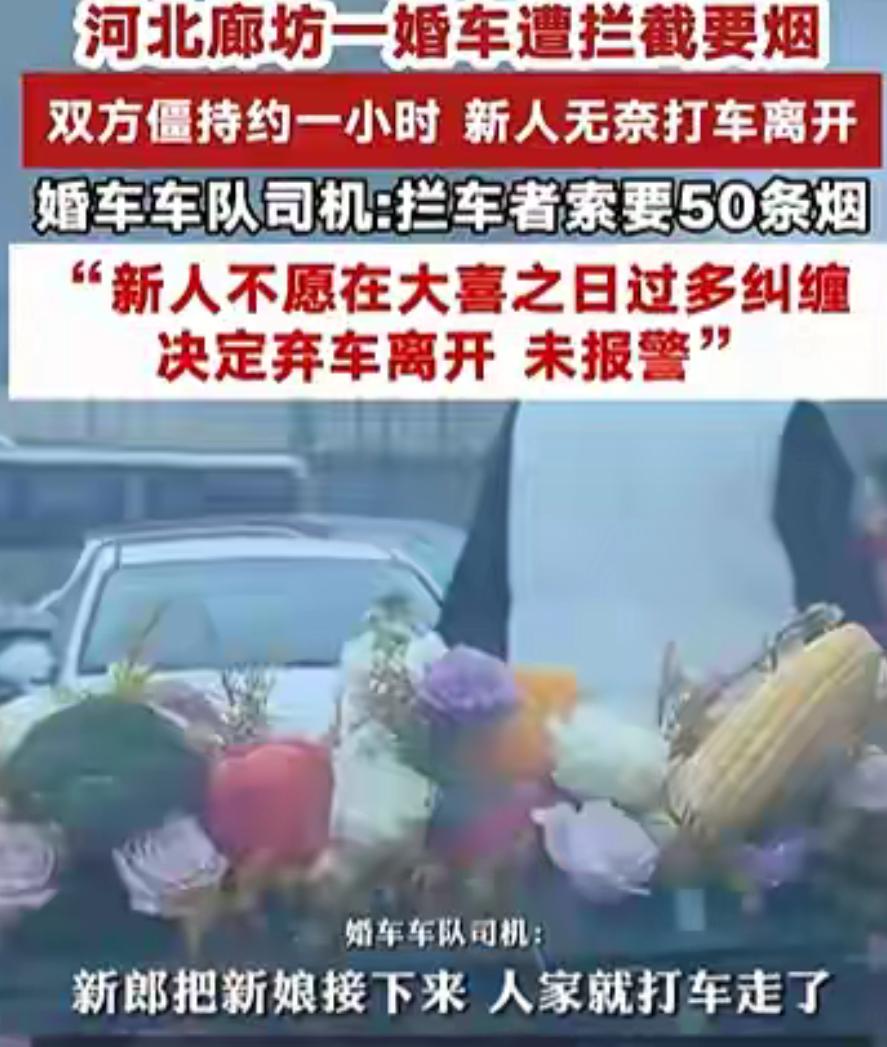 河北廊坊网传“婚车遭索50条烟”,后续通报来了,拦阻婚车的6人分别被给予行政处罚和批评教育处理。 事发11月5日,阻拦的婚车为新娘所住酒店的停车场,两方交涉20分钟无果,拦婚车者指定索要9条较贵的香烟,新郎新娘无奈不坐婚车,乘自家车离去。 有个细节,新娘离开时一步三回头,谁不想在新婚时候风光的坐上婚车出嫁,发生这事新娘遗憾中带着不甘。 “讨喜气”的意思,双方都乐呵的沾沾喜气,新人愿意给就拿着,不愿意给就算了,被现在有的人搞得变了味,遇到新人结婚要拦车堵门,趁机狮子大开口。 新人不愿报J,不是因为怕,只是不想大喜的日子添堵,各地均有打着习俗讨喜的口号来为难新人,实则就算敲Z。 应该打击这种变了味的讨喜,还婚礼一个安定,还社会一个安定。这起事件也告诉大家,结婚遇到这事,立马报J处理,不能惯着某些人,大家说是不是? 拦婚车陋习 光天化日拦婚车