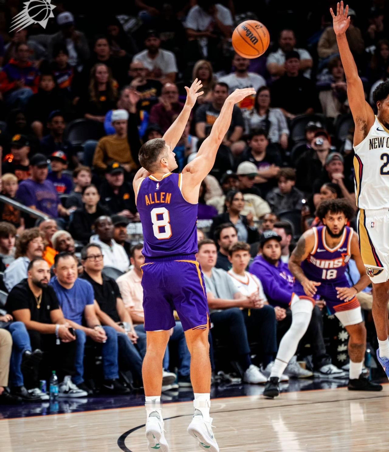 打手变射手,阿伦10记三分打破太阳队史记录 神奇的比赛日,今日各路神仙打架,坎宁安的大号三双、贝恩的飘逸三分绝杀、麦科勒姆的40+、文班的38+5盖帽但是都不及阿伦的10记三分。 太阳121:98轻取鹈鹕;布克终于躺赢一场,阿伦迎来了生涯之夜三分球15中10打破了队史以及个人的单场三分命中数,得分新高全场17中12爆砍42分3抢断。打手变射手,今天的阿伦值得今日最佳球员。 全场高呼MVP,今天的阿伦简直雷阿伦附体。