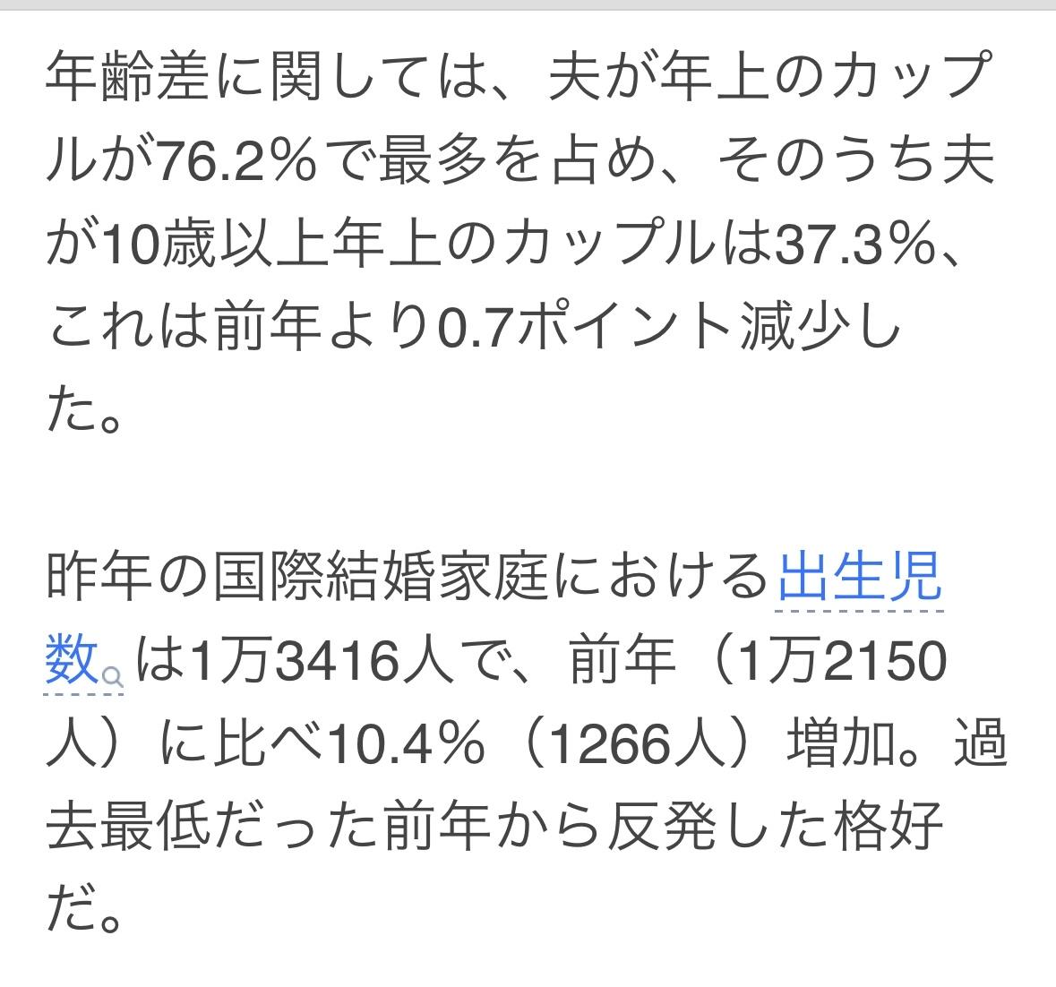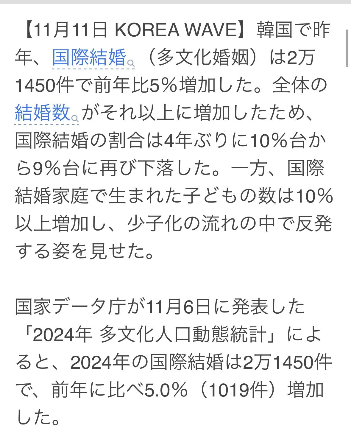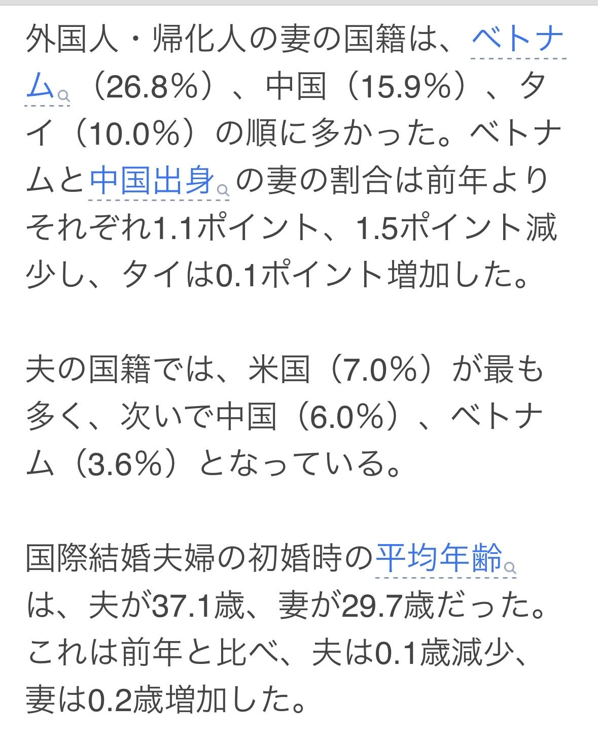 韩国去年跨国婚21450对,比前年增5% (增1019对)。在上升的结婚总数中,跨国婚四年来从10%降至9%,但跨国婚所生子女增10% 以上(增婴儿13416人)。 跨国婚形态,娶外国老婆的占71.2%,嫁外国丈夫的占18.2%。外国老婆中越南人占26.8%、中国人占15.9%、泰国人占10%。外国丈夫中美国人占7%、中国人占6%、越南人占3.6%。 跨国婚平均初婚年龄男37.1岁、女29.7岁。婴儿母亲国籍越南30%、中国12.2%、泰国5.4%。