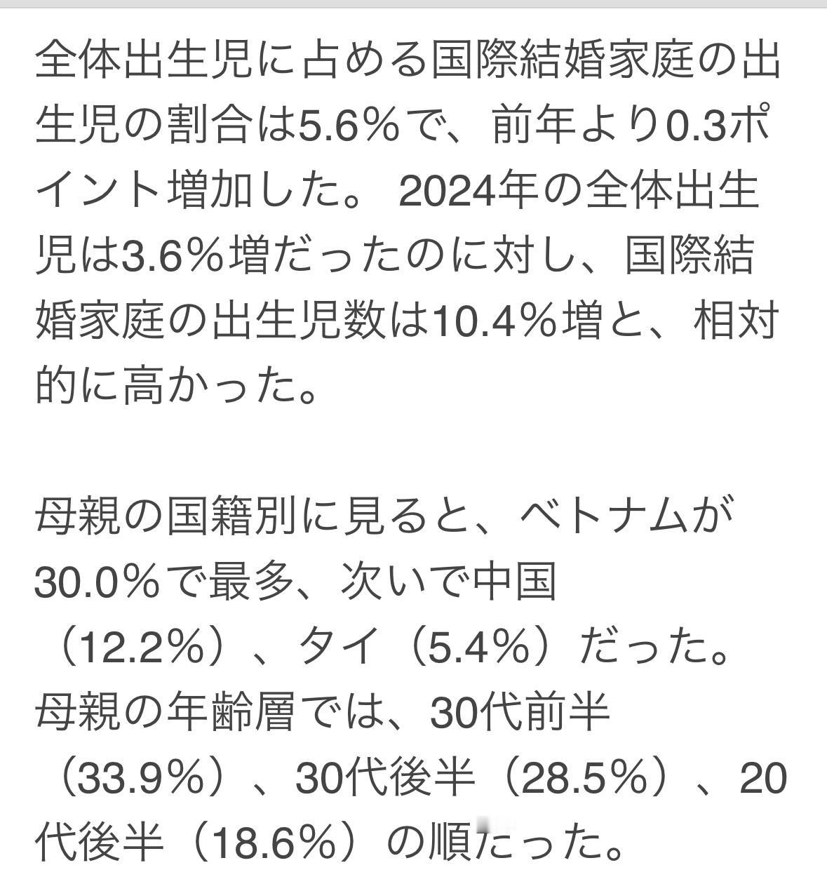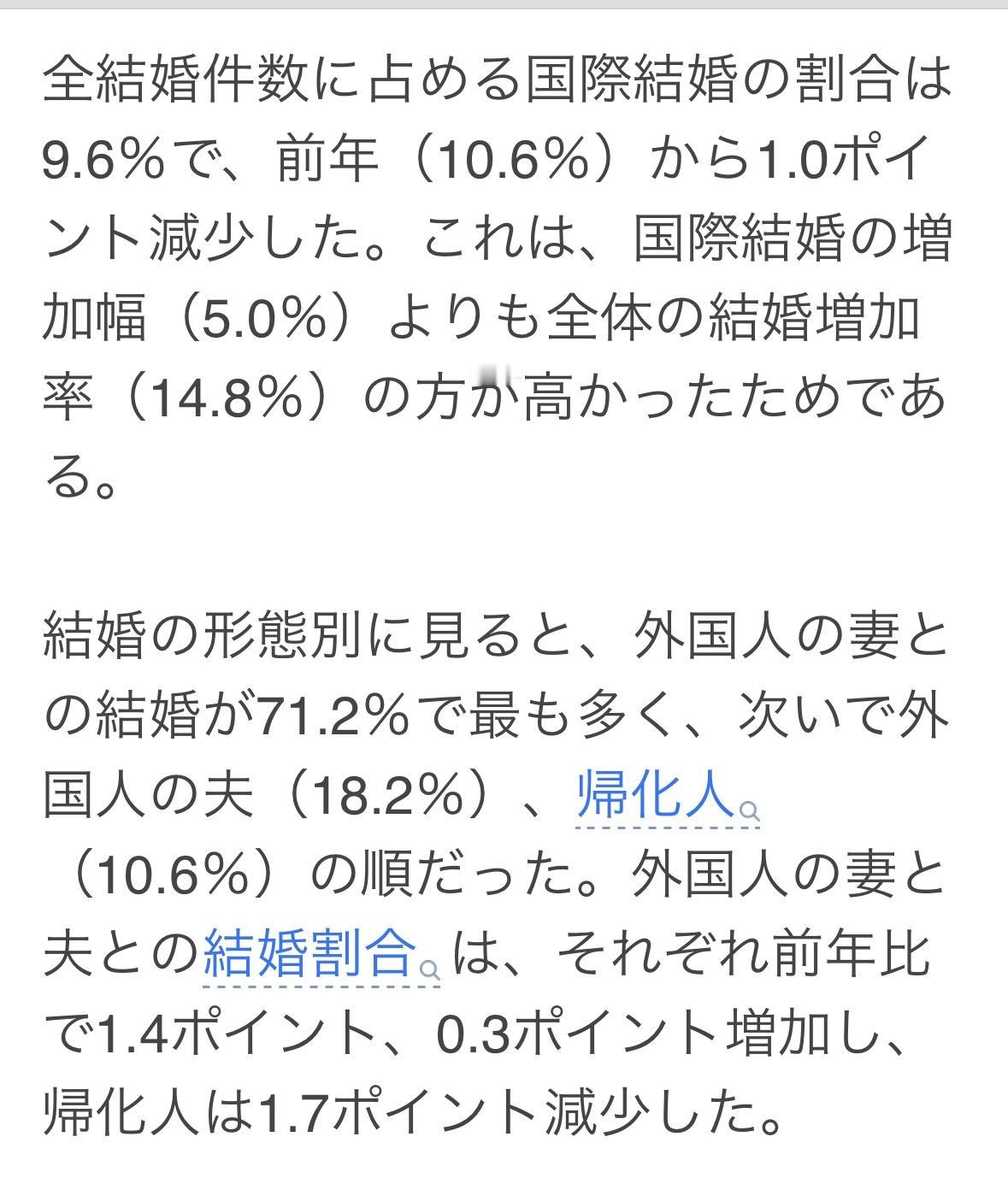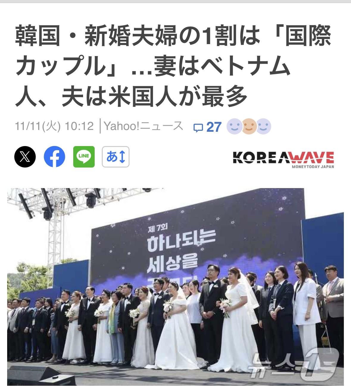 韩国去年跨国婚21450对,比前年增5% (增1019对)。在上升的结婚总数中,跨国婚四年来从10%降至9%,但跨国婚所生子女增10% 以上(增婴儿13416人)。 跨国婚形态,娶外国老婆的占71.2%,嫁外国丈夫的占18.2%。外国老婆中越南人占26.8%、中国人占15.9%、泰国人占10%。外国丈夫中美国人占7%、中国人占6%、越南人占3.6%。 跨国婚平均初婚年龄男37.1岁、女29.7岁。婴儿母亲国籍越南30%、中国12.2%、泰国5.4%。