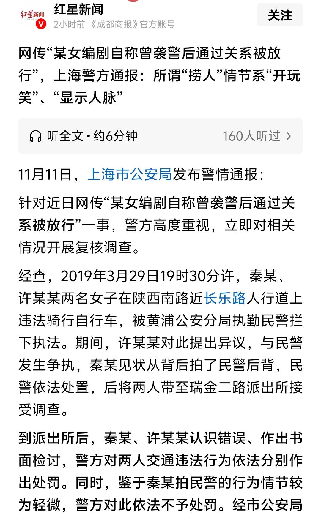 很显然上海警方对于这件事通报没问题,但是接下来没有处罚这个编剧就有点让人接受不了了! 录音中这个编剧自称警方的的人都是“小弟”,这是对于公安机关执法人员的严重污蔑,现在是新社会,上海滩已经不是民国前租界时期了,怎么还把公职人员叫做“小弟”呢?即便是开玩笑也不行! 假如说她不是著名编剧,只是普通人,我相信多数一定会被拘留罚款,但是这个编剧为何没被拘留罚款,这属不属于区别对待呢?所以期待上海警方下一次通报新的处理结果!