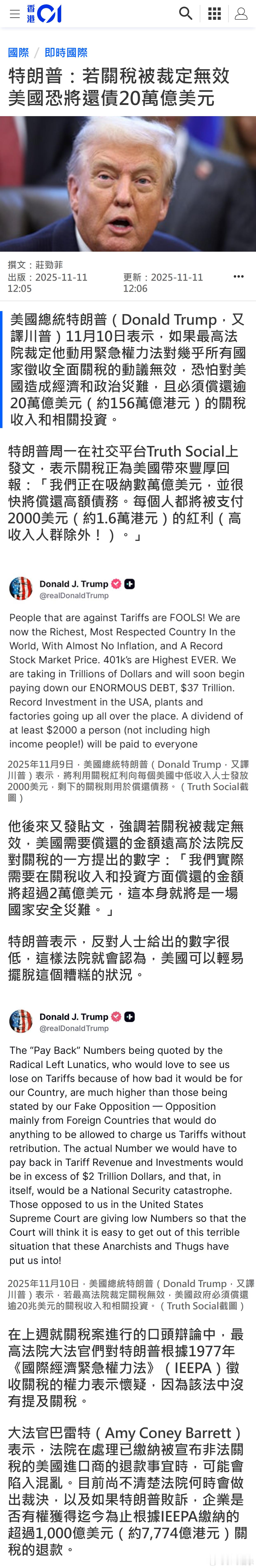 特朗普:若关税被裁定无效 美国恐将还债20万亿美元