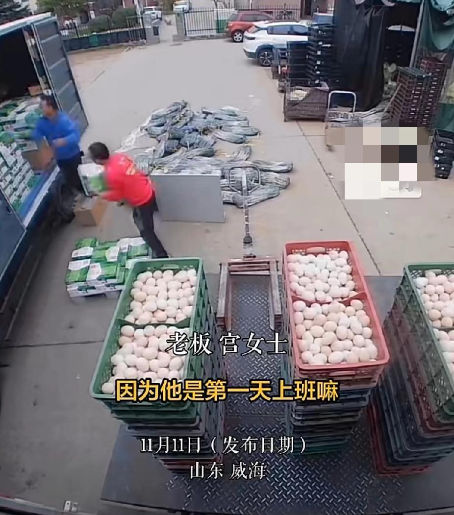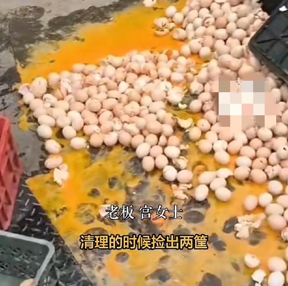 心也碎了一地啊!11月10日,山东威海一小伙按错遥控导致18箱鸡蛋碎一地。老板:“第一天上班不容易,就没让赔偿,碎了的鸡蛋给饲料厂做饲料了。” 老板宫女士说,小伙是因为第一天上班对遥控不太熟悉,不小心按错了遥控导致车的挡尾板倾斜,放在挡尾板上的鸡蛋就全部倒在了地上。 清理地面的时候挑出来两筐没有碎掉的鸡蛋,剩下的就卖给了附近的饲料厂作原料了! 宫女士的善良让一旁战战兢兢,等着赔偿的小伙瞬间放下心来。相信通过这件事情,小伙以后一定会加倍细心地完成每一项工作。 心碎的场景