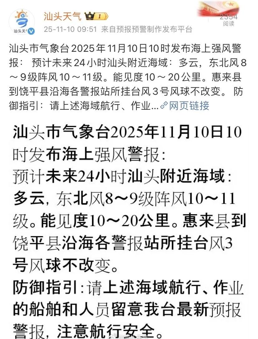汕头发布海上强风警报 汕头市气象台2025年11月10日10时发布海上强风警报:预计未来24小时汕头附近海域:多云,东北风8~9级阵风10~11级。能见度10~20公里。惠来县到饶平县沿海各警报站所挂台风3号风球不改变。防御指引:请上述海域航行、作业的船舶和人员留意我台最新预报警报,注意航行安全。 潮汕 潮汕旅游 台风 台风来了 汕头 汕头旅行 汕头旅游 南澳岛南澳岛旅游
