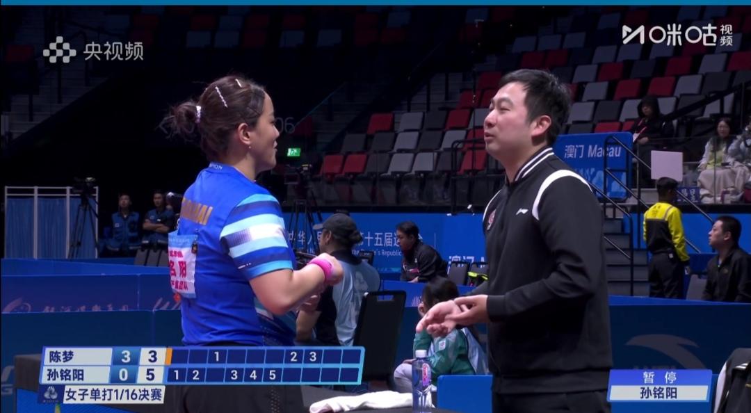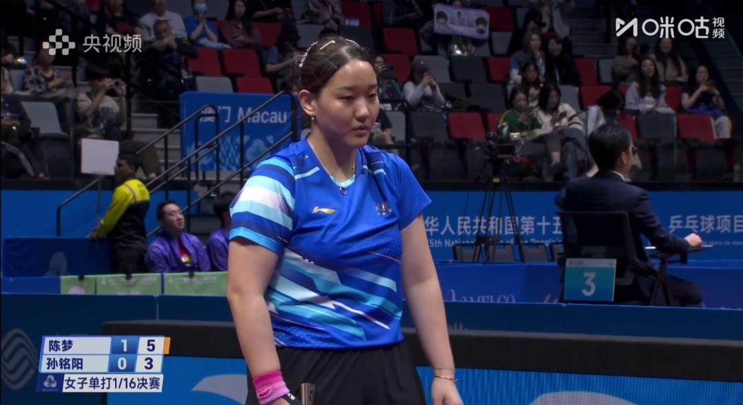 东京、巴黎单打冠军陈梦状态非常好,威风不减当年! 东京、巴黎两届奥运会单打冠军得主陈梦,还是参加第一届“老瓦”杯比赛,出现在赛场上! 如今九个多月过去了,第15届全运会迎来了乒乓球单打四号种子山东陈梦首秀,1/16决赛! 球迷期待太久了! 大梦和孙铭阳都来自山东青岛市,但孙铭阳代表上海队。 山东陈梦4:0(11-5;11-5;11-3;11-7)零封、速胜上海孙铭阳。 四局耗时仅33分钟! 孙铭阳人高马大,反手生胶,特殊打法! 陈梦步伐灵活,左右大角度,前三板解决,多板时还是大梦有厚度! 陈梦状态非常好,威风不减当年! 热烈祝贺陈梦晋级16强! 大梦目标进八强大有希望!