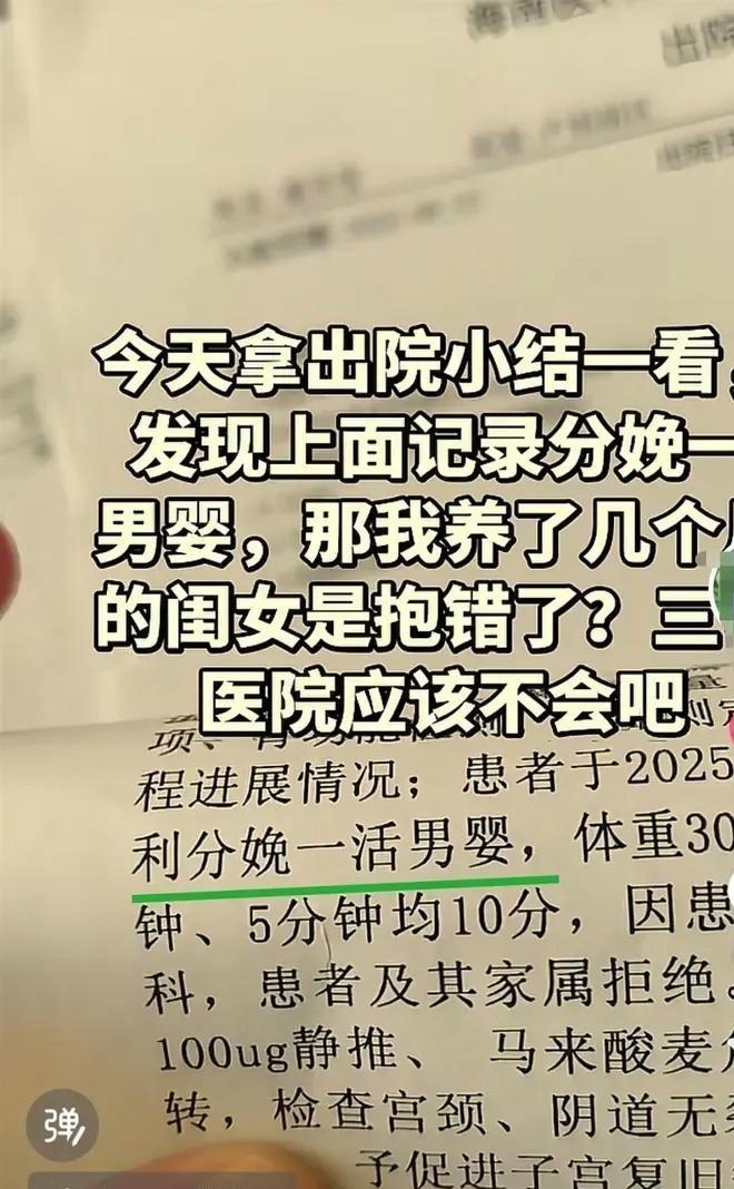 医院这句“自行检测”也太让人寒心了 海南一位妈妈的遭遇,好好养了三个月的女儿,翻出院记录发现写的是“活男婴”,这换谁不得慌:这是抱错了? 医院倒是轻描淡写:“不可能抱错,自行做亲子鉴定”。 这话真的太噎人了,你说这是工作失误、复制模板忘改性别,大家能理解,医院文书多、忙中出错是常有的事。 医院哪怕说句“您别慌,我们出钱做鉴定,马上查记录”,也比冷冰冰的“自行检测”暖多了。 孕期亲子鉴定