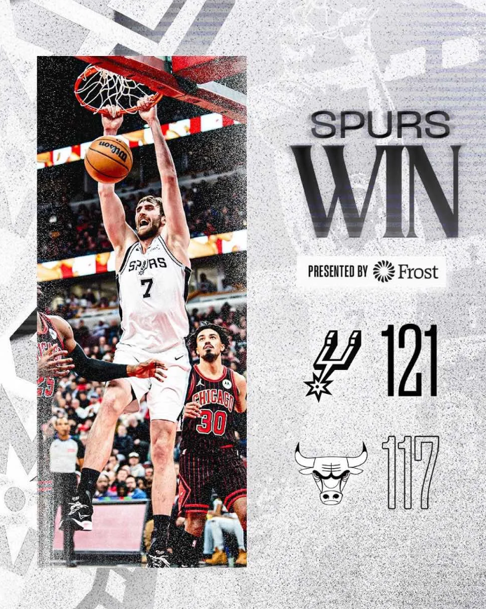 NBA常规赛马刺客场对阵公牛的比赛已经结束。全场战罢,马刺以121-117战胜公牛。 赛后,马刺社媒分享本场比赛逆转获胜海报并配文:马刺获胜! 此役获胜后,马刺常规赛战绩来到8胜2负。