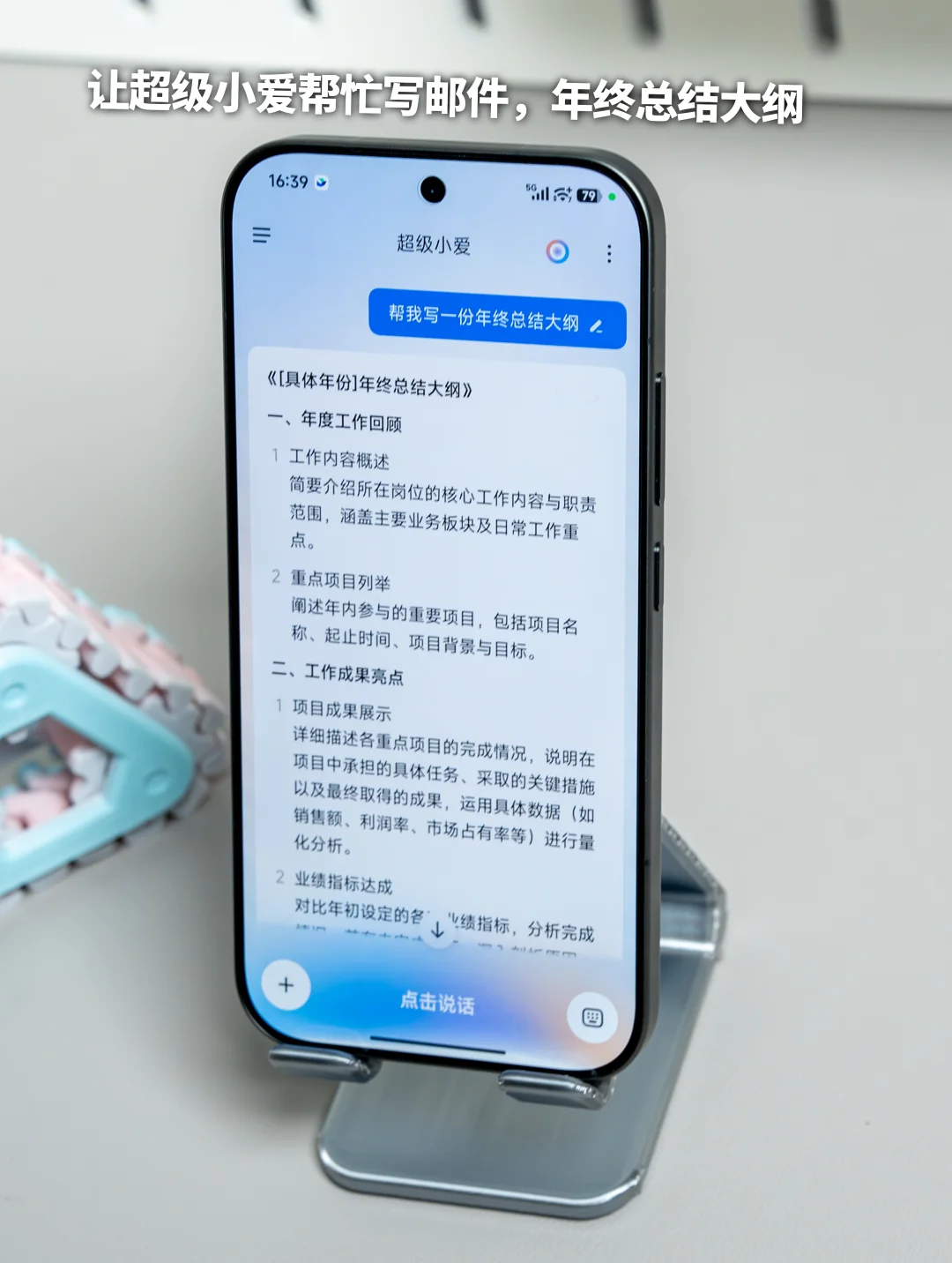 超级小爱能一键帮你生成文字内容,长按电源键对手机说“小爱同学,给我一份Q4项目复盘大纲”,超级小爱瞬间生成框架完整、逻辑清晰的初稿。