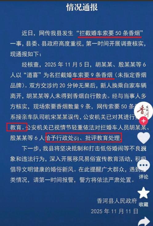 把拦路打劫当做婚礼风俗,河北廊坊的婚闹事件,当地对此事的回应更令人心惊。 把9条烟传成50条,批评教育。 “索要”9条烟,导致新人不能坐婚车,换车离开,也只是“行政处罚、批评教育”。 这真是公正、公平的体现! 属敲诈未遂,但给结婚新人造成一生遗憾!内心造成极大伤害! 必须严惩,还社会一个朗朗乾坤! 婚礼本是人间最开心的事,主人愿意分发礼品就好,强要就是黑社会手段。这股风气要坚决铲除,要把这几个人作为重点警示对象,从严处罚教育,还社会一个风清气扬的环境。