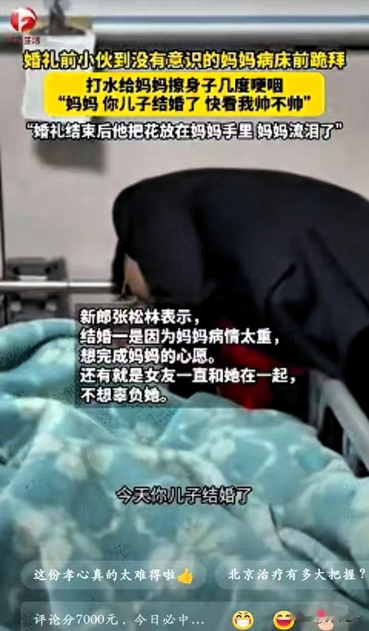 泪目了!河南开封这场“特殊”的婚礼,看完直接泪湿眼眶!新婚夜本该是洞房花烛、甜蜜相守,新郎却拉着新娘直奔医院,对着病床上昏迷不醒的母亲,恭恭敬敬磕了三个响头,这一幕戳中了无数人的泪点——这才是刻在骨子里的孝顺,从未被仪式感冲淡半分! 新郎打小就没了父亲,母亲一人含辛茹苦把他拉扯大,省吃俭用供他长大成人,在他心里,妈妈就是他的天、他的全世界。 可命运却开了个残酷的玩笑,几年前母亲突发脑出血,术后便陷入深度昏迷,成了没有意识的“植物人”。 这几年来,他从没半点放弃的念头,白天拼命工作赚钱凑医药费、生活费,晚上就扎在病房里照顾母亲,擦身、喂流食、按摩四肢、清理排泄物,还会一遍遍在母亲耳边唠家常,说说白天的趣事,哪怕母亲始终没有回应,他也坚持每天如此,从未有过怨言。 婚礼当天,他穿着笔挺的西装,风风光光把新娘娶进门,可心里的牵挂自始至终都在病房里。仪式刚一结束,他没顾上接受亲友的祝福,就捧着新娘的手捧花急匆匆赶往医院,小心翼翼地放在母亲枕边。让人泪目的是,原本毫无反应的母亲,像是感知到了儿子的喜悦,眼角居然缓缓流下了泪水——就算说不出话、睁不开眼,这份血浓于水的母子情,也从未断过牵连。 他趴在母亲耳边,声音哽咽却满是欢喜:“妈,你儿子结婚了,娶了个好媳妇,你快醒醒看看我们呀!”说完,便熟练地打水、拧毛巾,细细给母亲擦拭脸颊和手臂,动作温柔又自然,完全看不出是刚办完一场累人的婚礼。 更让人暖心的是新娘,全程静静陪在一旁,没有丝毫委屈和抱怨,还握着婆婆的手轻声安抚,主动跟新郎说:“婚后咱们第一时间带妈去北京求医,不管花多少钱、费多少精力,都要尽全力治,咱们一起陪着妈等她醒来。”这哪是娶了个媳妇,分明是给母亲多添了个贴心的女儿! 如今太多人把“孝顺”挂在嘴边,可真到了利益、仪式面前,能像新郎这样把母亲放在首位的太少了。他用行动证明,孝顺从不是长大后的弥补,也不是物质上的堆砌,而是无论人生走到哪一步,都忘不了是谁含辛茹苦养育自己,忘不了在最艰难时是谁为自己撑起一片天。 妈在,家就在。这场没有烛光的新婚夜,没有甜蜜私语,却有着最动人的亲情与孝心。这样有担当、懂感恩的新郎,这样明事理、有爱心的新娘,活该他们幸福一辈子!