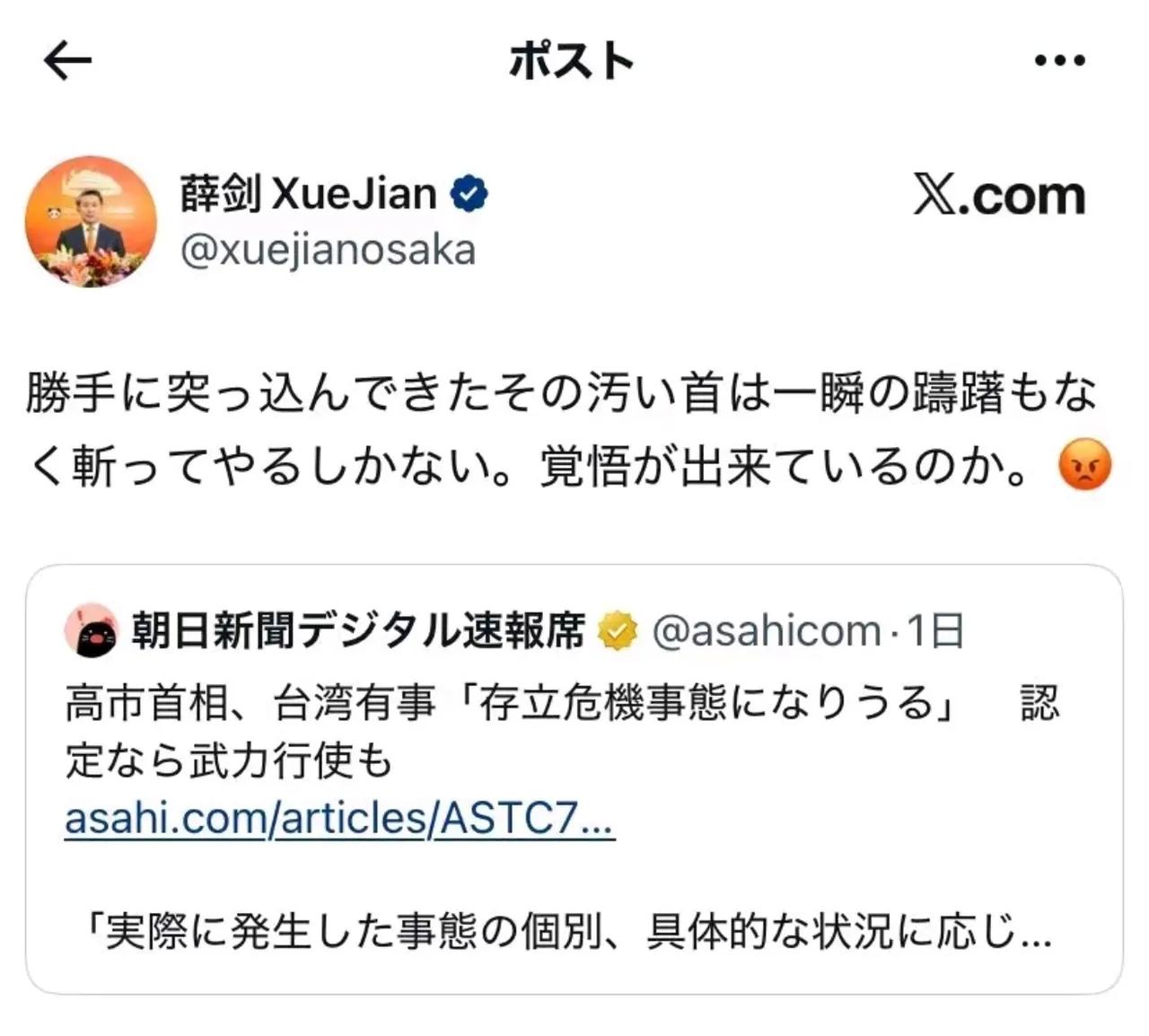 一边是薛剑领事在日本国土上为国家主权怒而亮剑,寸步不让;一边却有国人躲在背后,给日本侵略历史洗白——这对比,真让人又气又寒! 同样是炎黄子孙,同样踩着先辈浴血换来的太平,凭什么有人敢直面侵略者的恶行,用硬气守护家国尊严;有人却偏偏要跪着,忘了先辈流过的血,忘了民族受过的辱,甚至帮着外人歪曲历史?更可恨的是,他们连两岸统一都不认同,分明是端着祖国的碗,砸着祖国的锅! 这些人哪是什么糊涂虫,分明是丢了民族骨气,被利益或虚无史观迷了心窍。他们忘了,今天的安稳不是天上掉的,是无数先烈用命拼出来的;两岸同根同源,统一是刻在骨子里的必然,容不得半点动摇。薛剑领事的硬气,戳破的是外部势力的虚伪,更照出了这些人的卑劣——连自己的历史都不敢认,连自己的国家都不守护,还有什么资格谈“炎黄子孙”? 想想真让人费解,这些人明明享受着国家发展的红利,却偏要做损害民族利益的事。你觉得他们是真糊涂,还是故意为之?