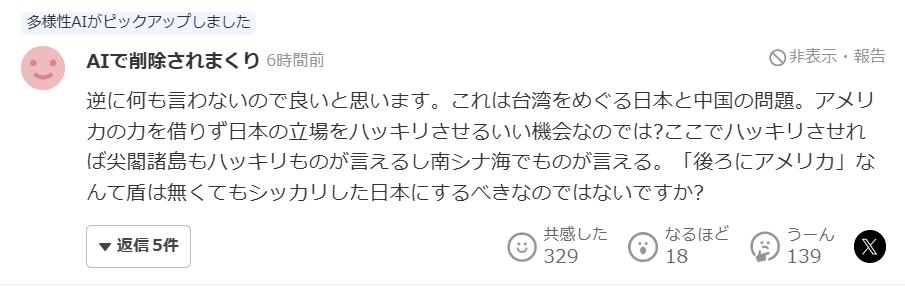为什么日本永远不把中国放在眼里,连个什么高市草苗这个女人也敢公开挑战我们。? ------------------------------------ 在这点上,你不得不佩服日本作为发达国家,在信息茧房这块确实是有一套 在他们锲而不舍的宣传下,导现在很多日本人都觉得老中战斗力弱的一批只有花架子远不如我们带日本弟国,比如今天懂王评价前两天薛剑大使在X上对车力言论的回应,这个事今天日本也报道了 然后下面的日本人是这么留言的 反而我觉得什么都不说反而更好。这是日本与中国之间围绕台湾所产生的问题。这不正是个无需借助美国的力量就能明确表达日本立场的好机会吗?在这里明确一点的话,尖阁诸岛的问题也可以明确地说出来,南海的问题也可以明确地说出来。即使没有“背后有美国”这样的盾牌,也应该把日本打造成一个自信的国家,不是吗?所以我觉得,这是个好事。既然你日从上到下都觉得自己这么牛逼,老中不过是随手可灭的落后国家,那为什么不赶紧来试试呢?