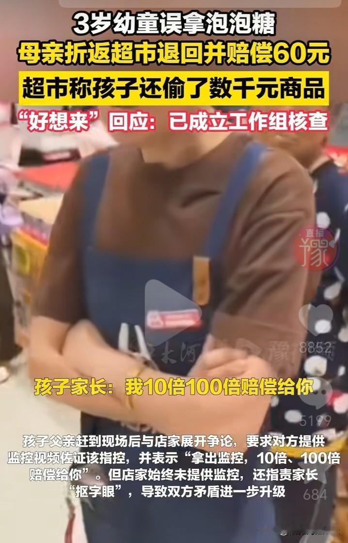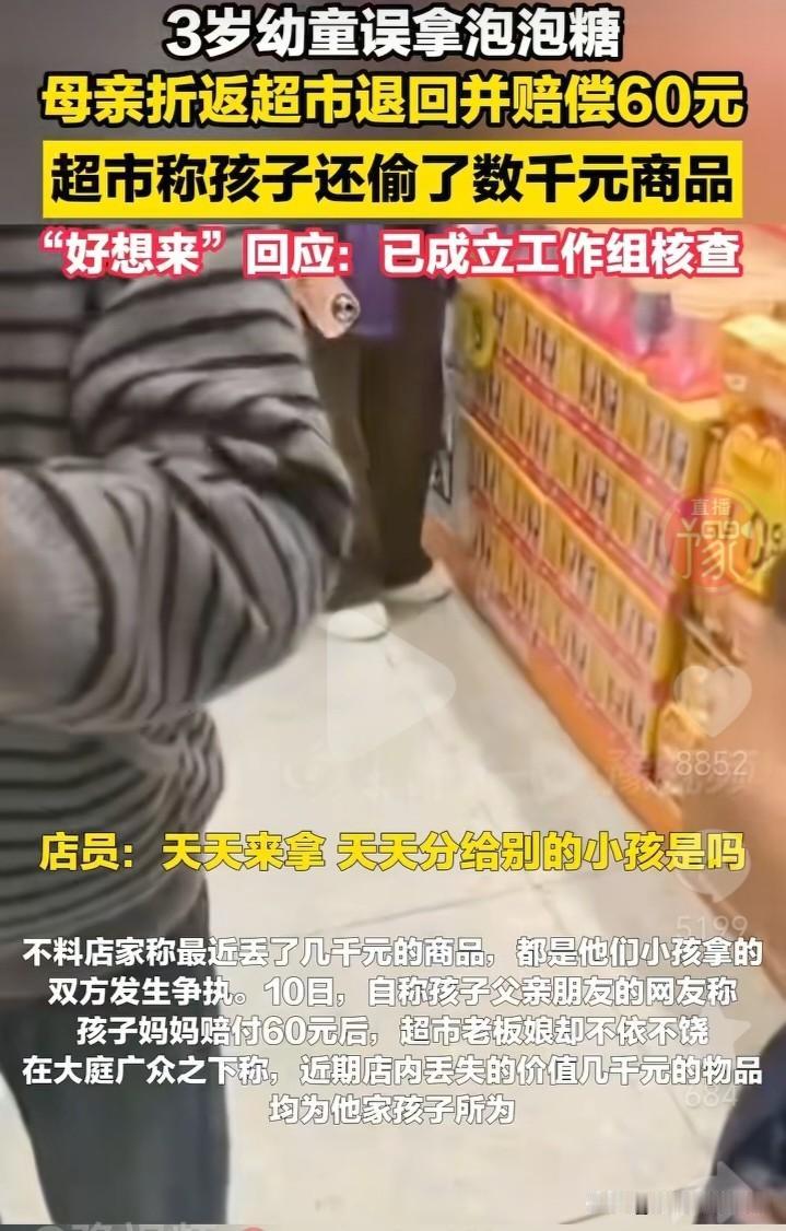 闹大了!3岁幼童误拿两个泡泡糖,母亲主动送还并赔60元,却被赖上数千元,双方矛盾升级,已成立工作组核查。 11月7日,苏州一个3岁男童随妈妈一起出来玩,同行的还有一个小孩。妈妈在门囗买东西,两小孩逛“好想来”。 后来,妈妈发现两个孩子拿了两个泡泡糖未付款,店员也发现了,妈妈就带着两孩子去付款。 店员要求赔偿,并且按上一买单人的金额赔偿,虽然不知依据啥,但妈妈也同意并支付了60元。 本以为事情就这样划上句号,不曾想,老板娘不依不饶,在大庭广众之下说,最近丢了几千元的东西都是这个孩子拿的,并称有证据。 几千元的东西,一个3岁的孩子能偷得了吗?既然发现了,当初怎么不报警? 小孩的爸爸就前来理论。一名店员说,这个小孩天天来偷,偷出来的东西分给别的小朋友。 另一名店员说,小时候偷针,长大偷金。 对一个3岁的孩子扣上这么大顶帽子,搁哪个家长都不愿意。 小孩爸爸让店家拿出视频证据,你不是说每天来偷吗?拿出证据愿意按100倍,甚至1000倍赔偿。 店家不仅提供不出证据,还说家长抠字眼。 家长气愤之余向“好想来”总部投诉无果后,将视频上传到网上。 事情进一步升级,“好想来”回应:己成立工作组核查。 饭可以乱吃,话不能乱说。拿不出证据就是诬陷,不负责任的话会毁了孩子一生。 作为成年人说话要注意分寸,3岁小孩将他定性为偷,是不是有些缺德。孩子有个成长的过程,真偷了,可以与家长联系,家长不认,可以选择报警。 孩子父亲也拿出了态度,如属实,愿意以百倍赔偿,店家此时硬撑拿不出证据和态度就是打自己的脸。