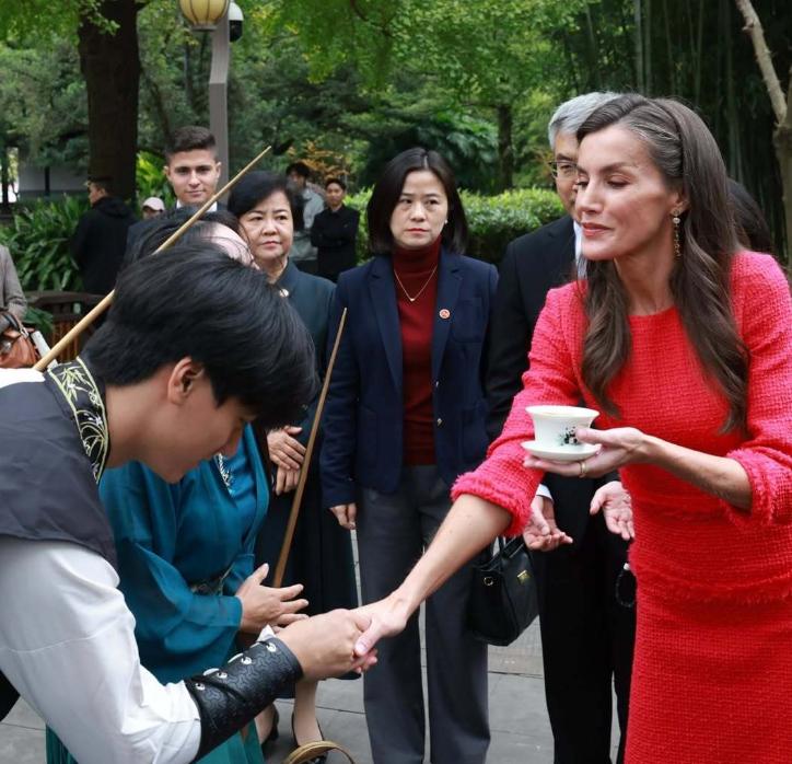 西班牙王后品茶,端着茶杯的姿势优雅又贵气!11月11日西班牙王后在成都观看茶艺表