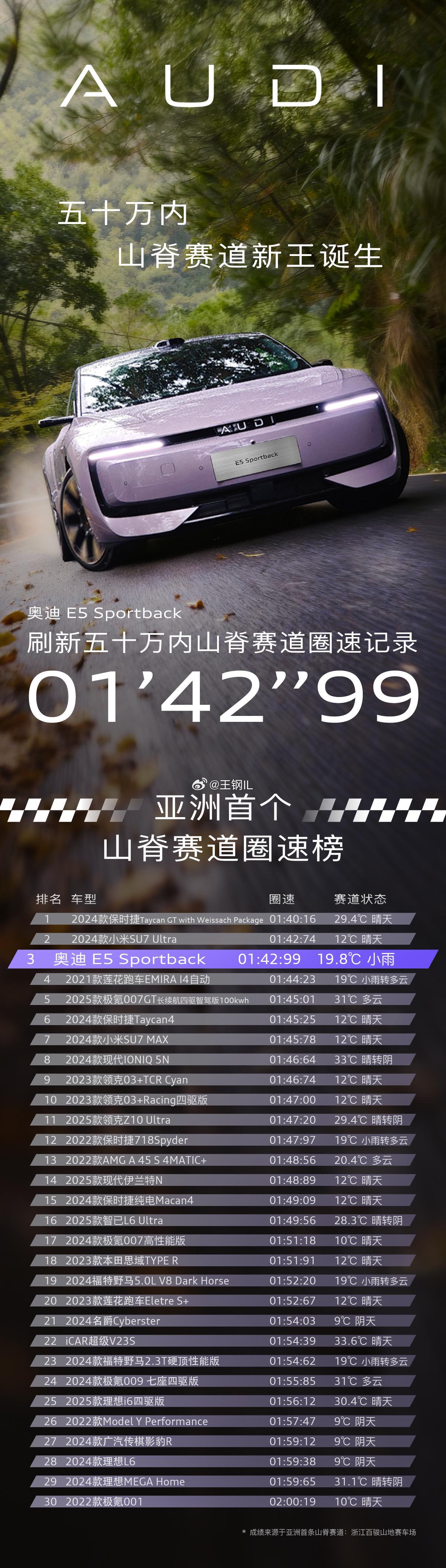奥迪E5 Sportback于佰骏山地赛道(2.42公里/31弯/71米落差)刷新50万内圈速纪录,1分42秒99跻身前三。电动quattro实现10毫秒实时计算、100毫秒扭矩分配,搭配采埃孚CDC减震+大陆空悬的王牌底盘,3.4秒零百加速与32.8米刹停同级领先,机械素质与智能电控双优,赛道日常两相宜。