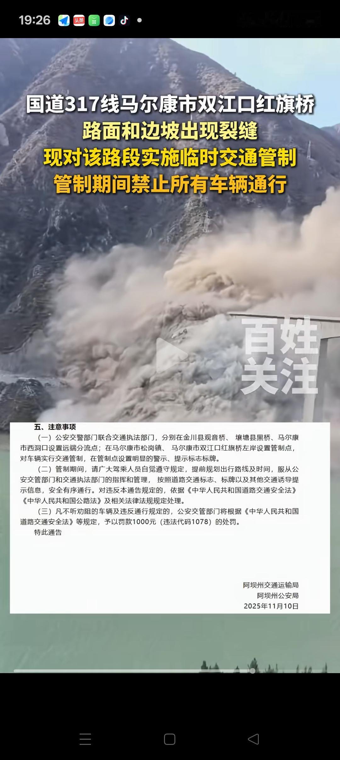 四川阿坝红旗特大桥发生垮塌,承建单位负责人要睡不着觉了!要知道今年1月份大桥才合龙,还不到一年的时间。虽然也查清楚了是山体滑坡导致的边坡裂缝引起的,还提前一天管理了,没有任何伤亡。 但是这么大一座桥塌了,肯定要有个说法,设计,施工,用料都会有个很清晰的结论。。 值得庆幸的是,当地的工作人员在11月10号发现桥面和边坡出现了裂缝,并第一时间向上级汇报。上级也很重视,及时关闭了大桥。 向巡视的工作人员致敬,谢谢你们[祈祷][祈祷]