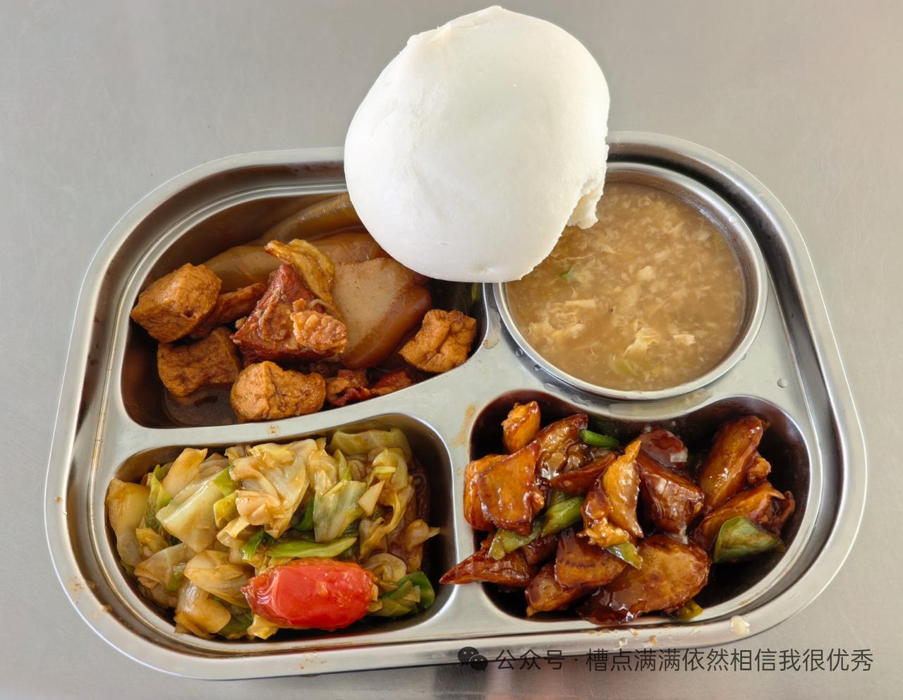 公司食堂的午餐,3块钱,粉皮炖肉,地三鲜,炒包菜。汤和馒头是免费的,大家感觉咋样?虽没有大鱼大肉,但3块钱就能吃饱,确实不错。