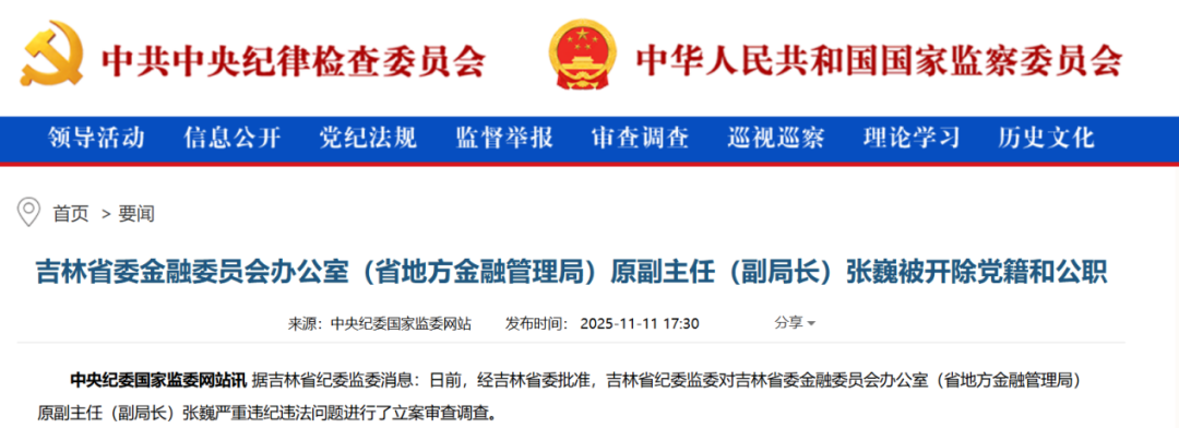 11月11日,中央纪委国家监委官网通报:吉林省委金融委员会办公室(省地方金融管理局)原副主任(副局长)张巍被开除党籍和公职,四川农村商业联合银行股份有限公司原党委委员、副行长刘杰被开除党籍和公职。