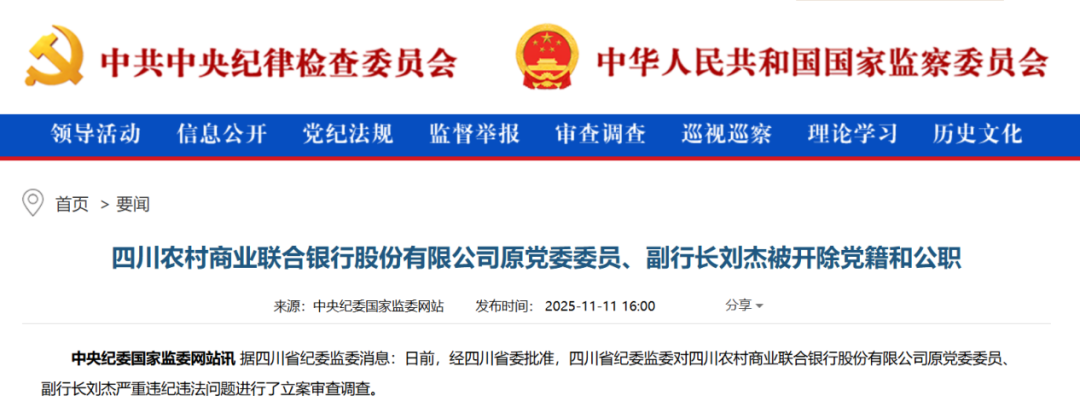 日前,经四川省委批准,四川省纪委监委对四川农村商业联合银行股份有限公司原党委委员、副行长刘杰严重违纪违法问题进行了立案审查调查。