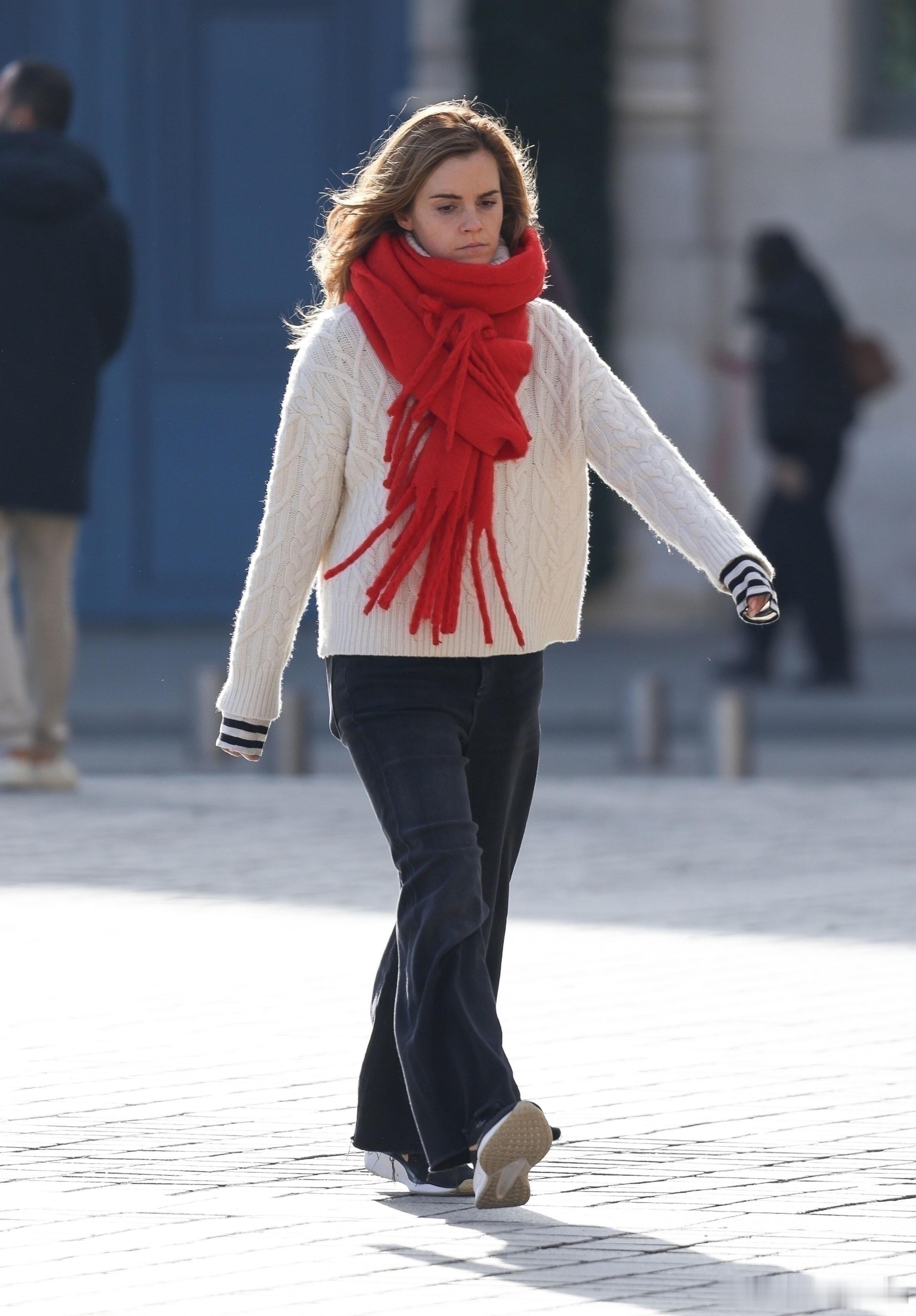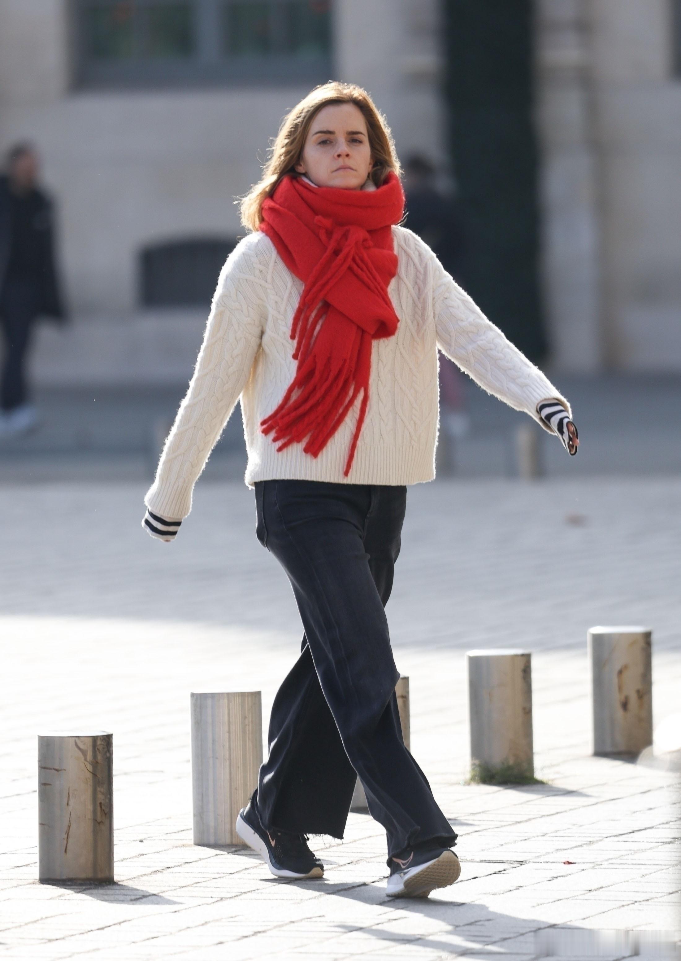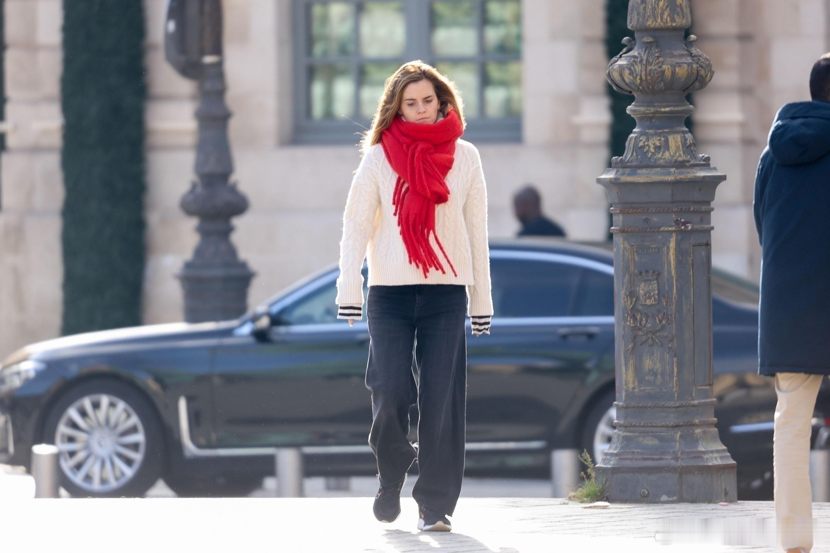 艾玛沃特森在巴黎外出,艾玛身着白色高领毛衣搭配一条厚厚的红色围巾🧣看着就很暖和🔥