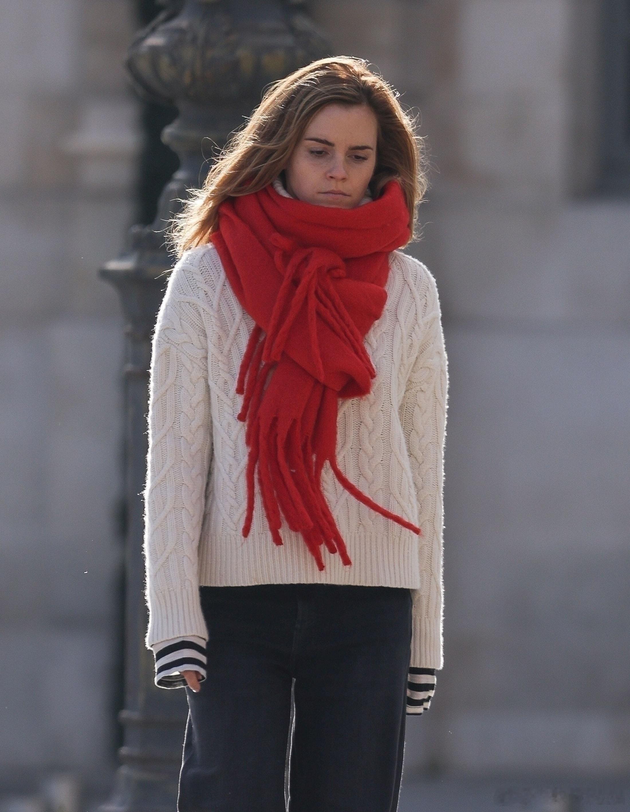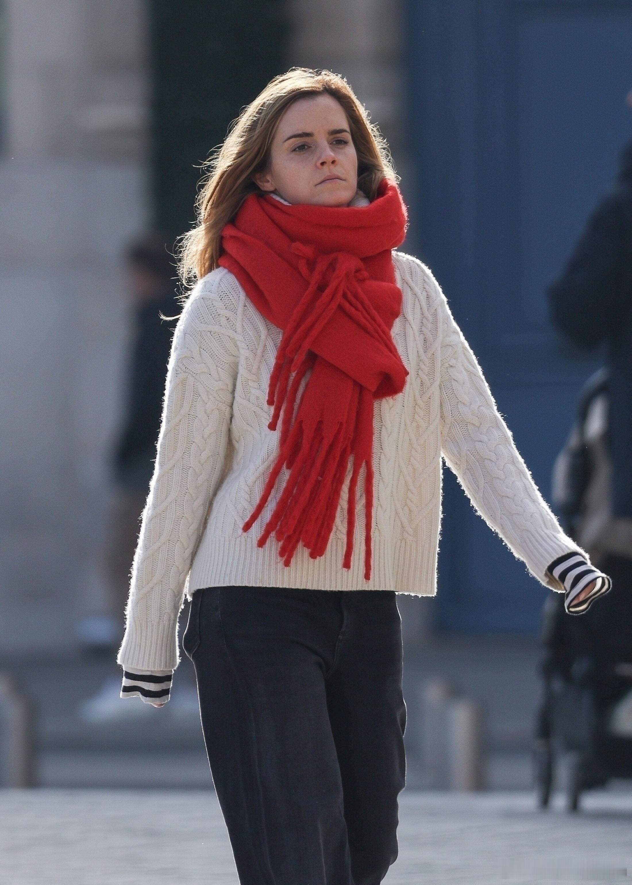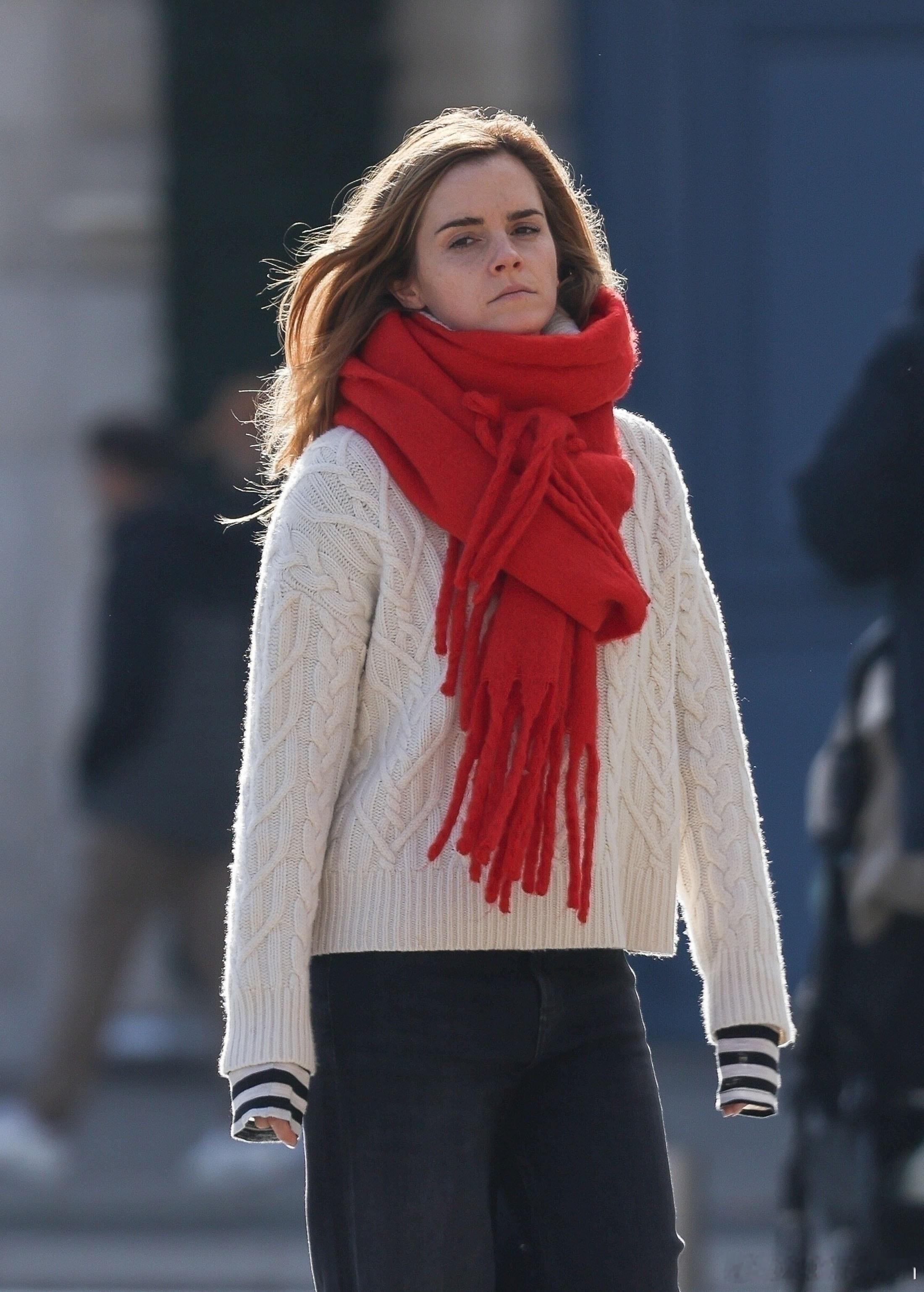 艾玛沃特森在巴黎外出,艾玛身着白色高领毛衣搭配一条厚厚的红色围巾🧣看着就很暖和🔥