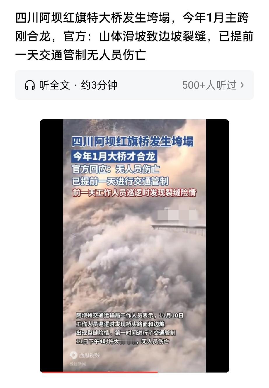 四川一条刚修好几个月的桥塌了, 好在没有人员伤亡, 只要人没事, 其它都是小事, 不过建这个桥肯定也得不少钱吧, 想想还挺让人心疼的, 有网友说可能是豆腐渣工程, 我觉得可能性不大, 这种特大桥没人敢偷工减料, 很大可能是设计问题, 而且常规的设计都是经过验证的, 也不会有问题, 我猜测可能是现场环境特殊, 设计师没考虑周全, 所以才会这样 什么特殊的现场环境没考虑到