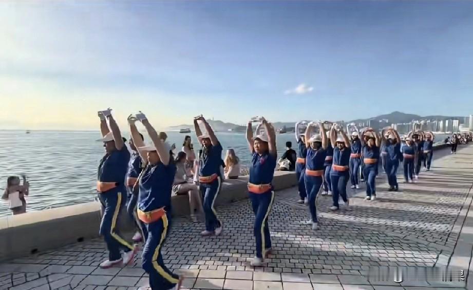 暴走团在内地已经没有新鲜感了,被很多人排斥,现在开始发展到香港了,这支队伍直接在维多利亚港走着她们高傲的步伐。 统一的着装,统一的帽子,统一的步伐,看年龄应该都是退休后不久的,50岁以上吧。个个精神抖擞,喊着口号,迈着大腿昂首挺胸走着。 引起了很多外国人的目光,不知道她们在那边受欢迎不?