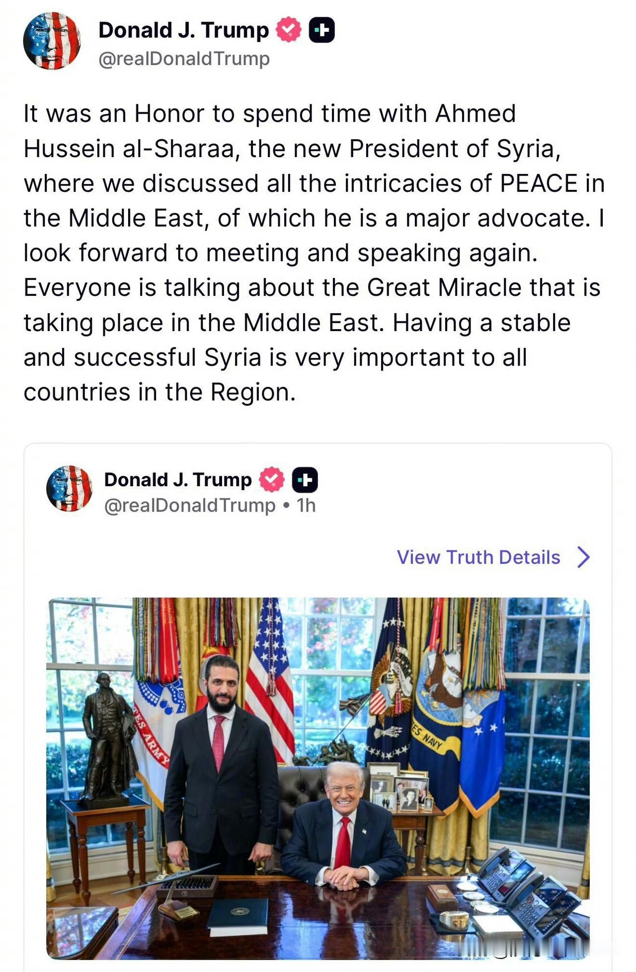 看看吧!摄影师拍的不错,一个站着,一个坐着,都是西服加红领带,有人说朱拉尼到白宫穿的比泽连斯基强多了,对特朗普挺尊重的,也许是吧。 其实,本来两个人的会晤是一场闭门会议,不对外公布的,但是,特朗普还是没有忍住,发了帖子,话里话外他与朱拉尼的谈话,谈的挺满意的,下次还想见面!