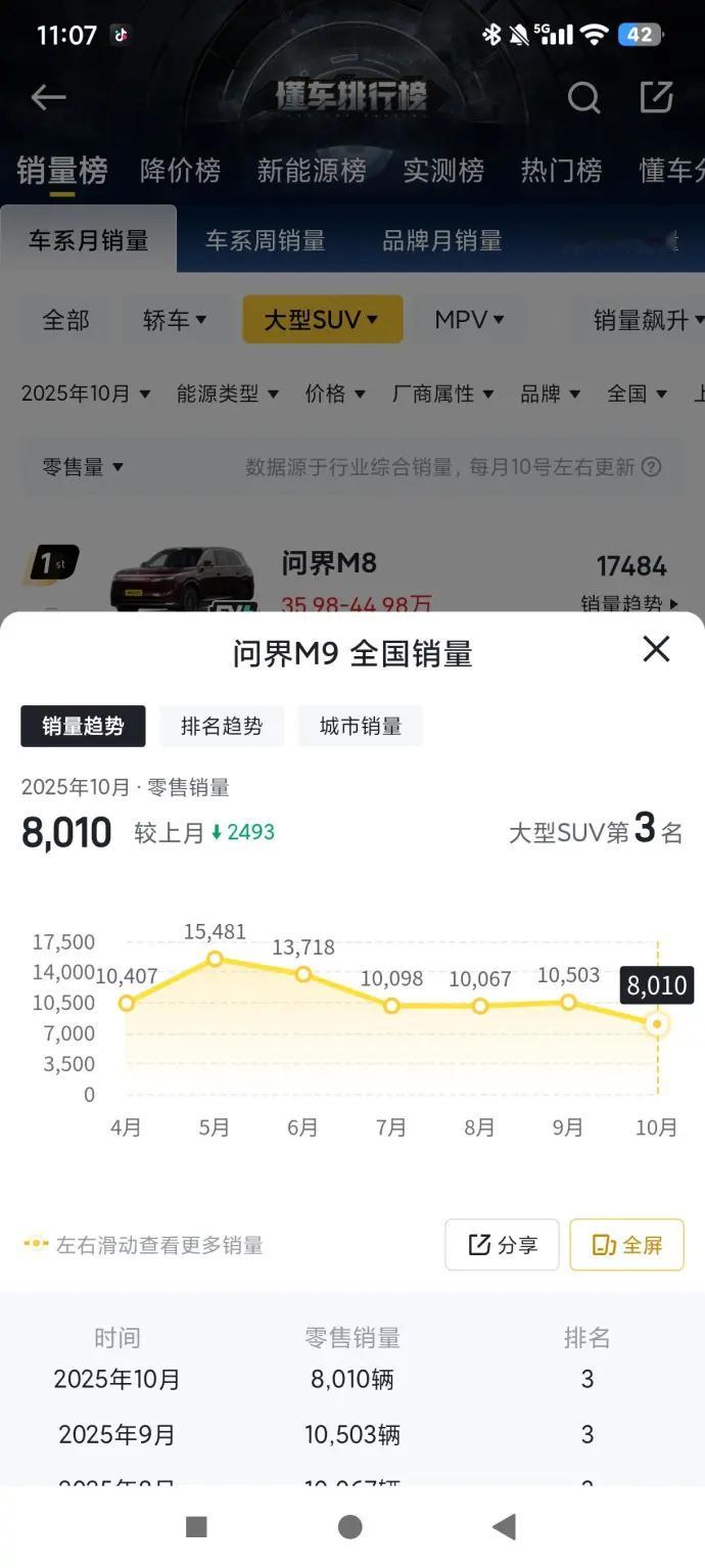 M9的时代过去了,从24年1月到25年11月,这款车火爆了整两年,如今也该落幕了,这款车的销量基本被M8吸走了。现在市场更新换代太快,之前市面上同类型的产品太少了,很多人买M9是没得选,现在像9X,岚图泰山这种同类型的产品多起来了,大家选择更多了,自然会吸走M9一部分客户,但是M9这个销量还是十分吓人的,M9能火这么长时间不容易,该改款了,别的不说外观可以优化一下,现在的外观不够大气,设计上不如M8和M7成熟。